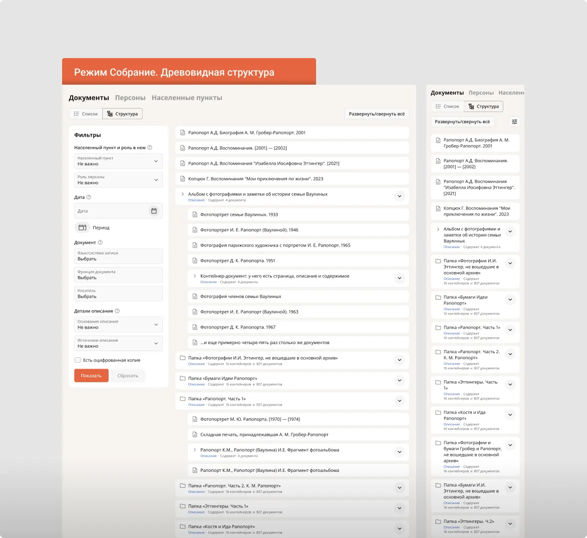 Например, когда мы проектировали отображение структуры собрания — страницы с информацией об отдельном архиве и визуализацией его структуру), нам было сложно понять масштаб и вложенность таких собраний. От заказчика мы узнали, что в архивах могут быть сотни документов, распределенных по сложной иерархии собраний. И оптимальным решением стало отображение структуры собраний в виде классического дерева с возможностью переключиться в режим списка.