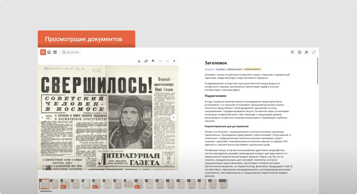 - Просмотрщик документов (позволяет перемещаться между страницами документов, а также выбирать режимы отображения «документ / распознанный текст»).