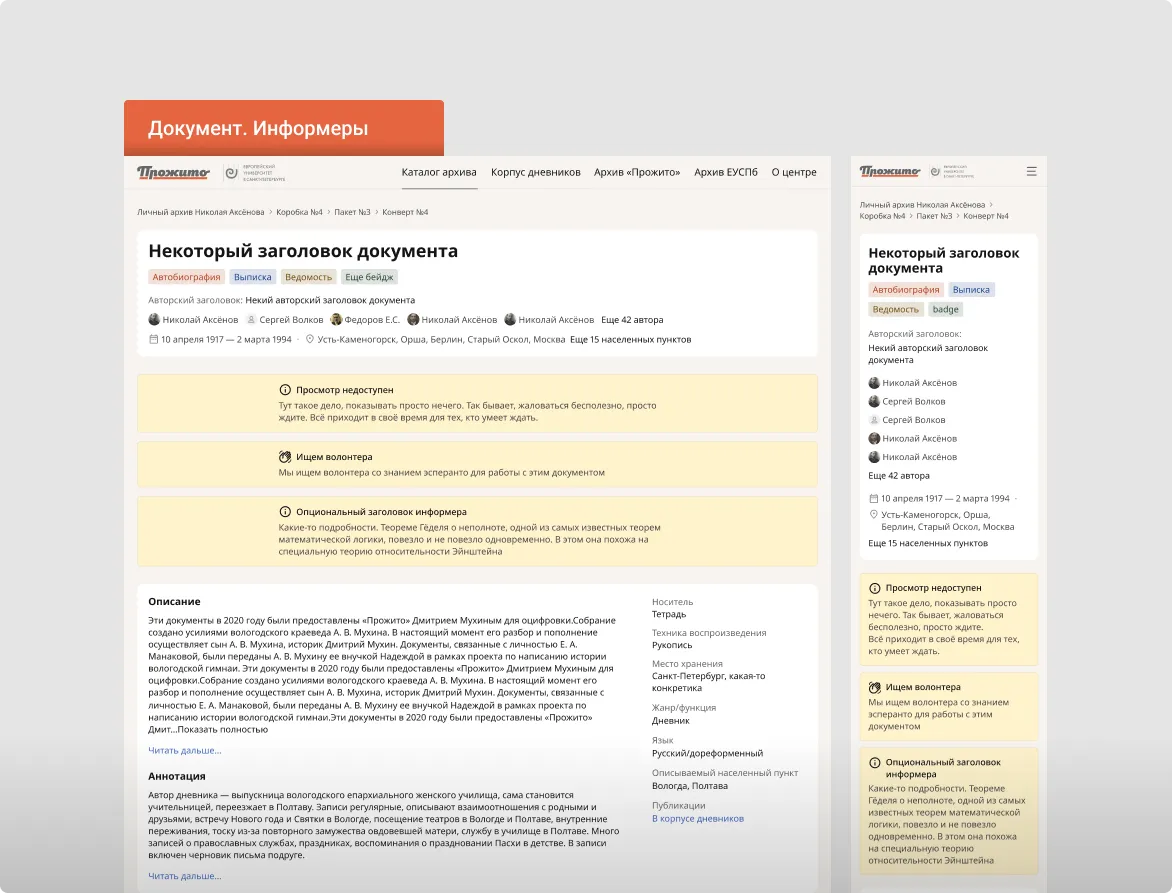 2. Спроектировать и создать интерфейс каталога архива «Прожито» (как для десктопа, так и мобильную версию), провести тестирование прототипа, передать макеты в разработку.