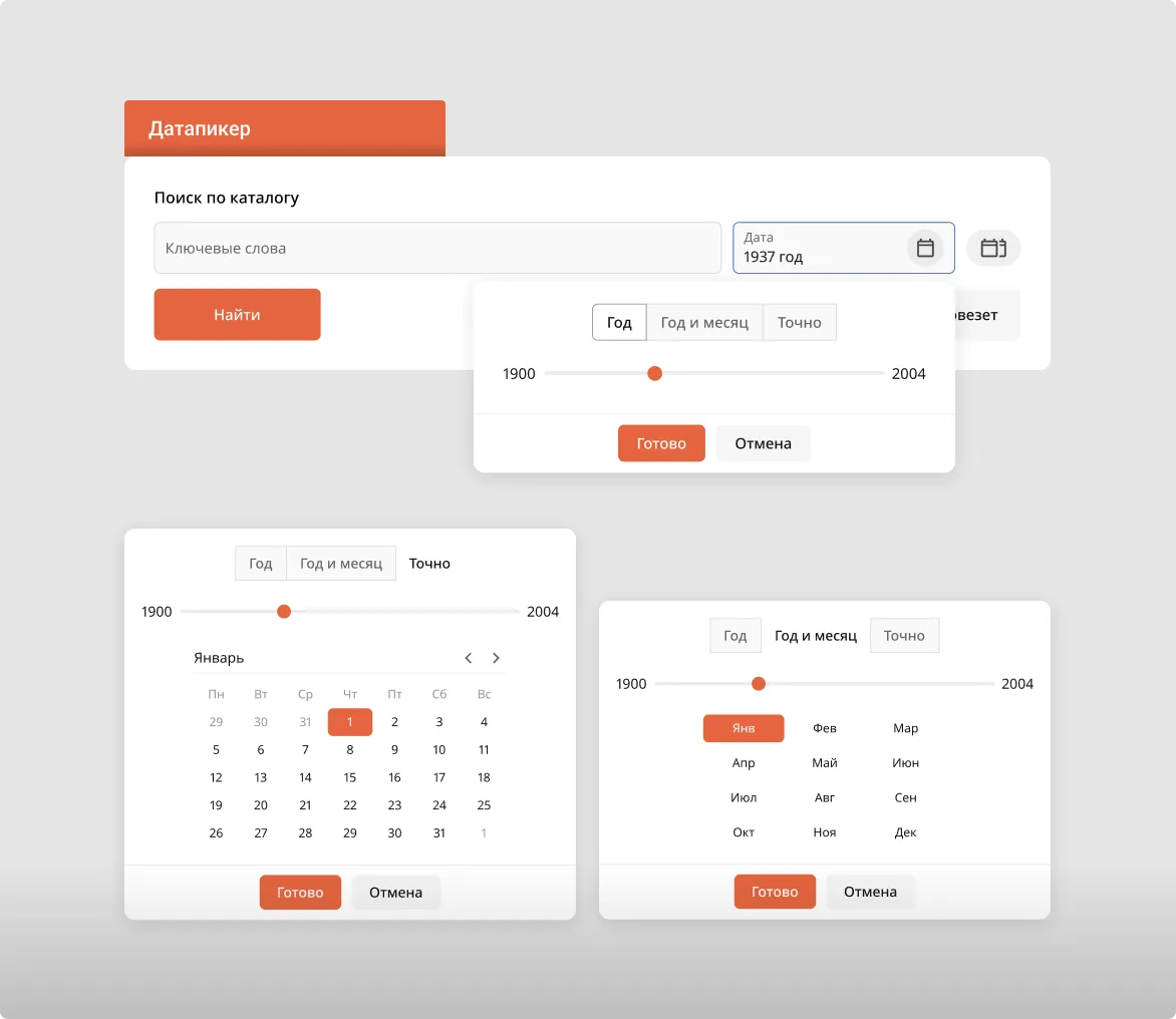 - Датапикер (несколько концептов выбора диапазонов дат, для поиска документов / архивов / персон)