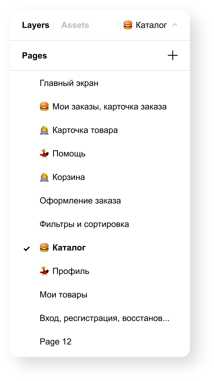 В этом проекте мы придумали новый способ распределять полномочия между дизайнерами. Для этого разделили весь проект на разделы в Figma и для каждого сразу создали отдельную страницу. Каждый дизайнер мог браться за что хочет. Только нужно было заранее отметить страницу своим эмодзи, чтобы другие видели. Хотя все обсуждали и в живых разговорах, конечно. Но порядка стало больше. Выглядело это так.