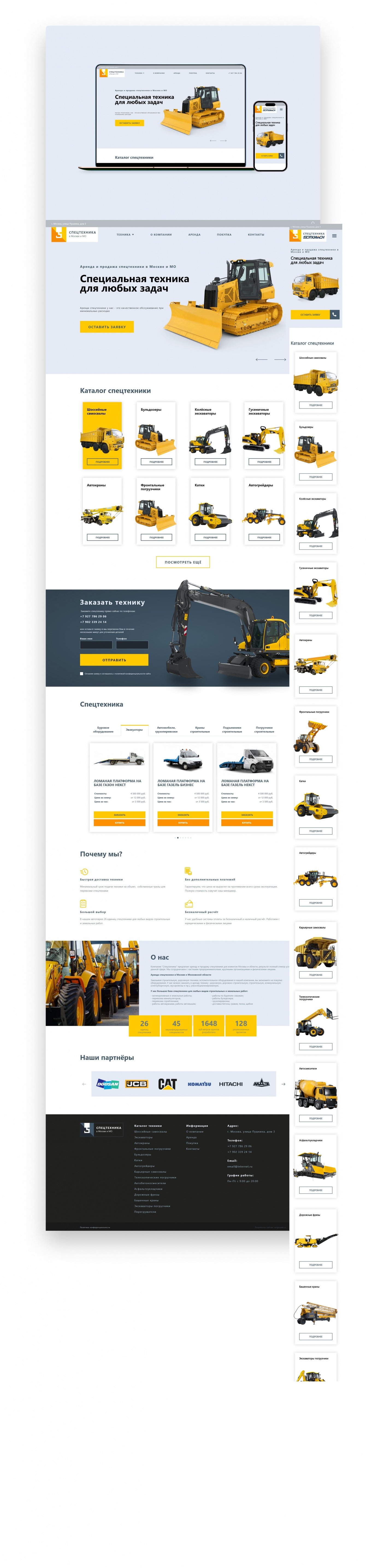 В результате выполненных работ, был разработан интернет-каталог в современном и лёгком стиле, с возможностью оставить заявку на аренду или покупку спецтехники.