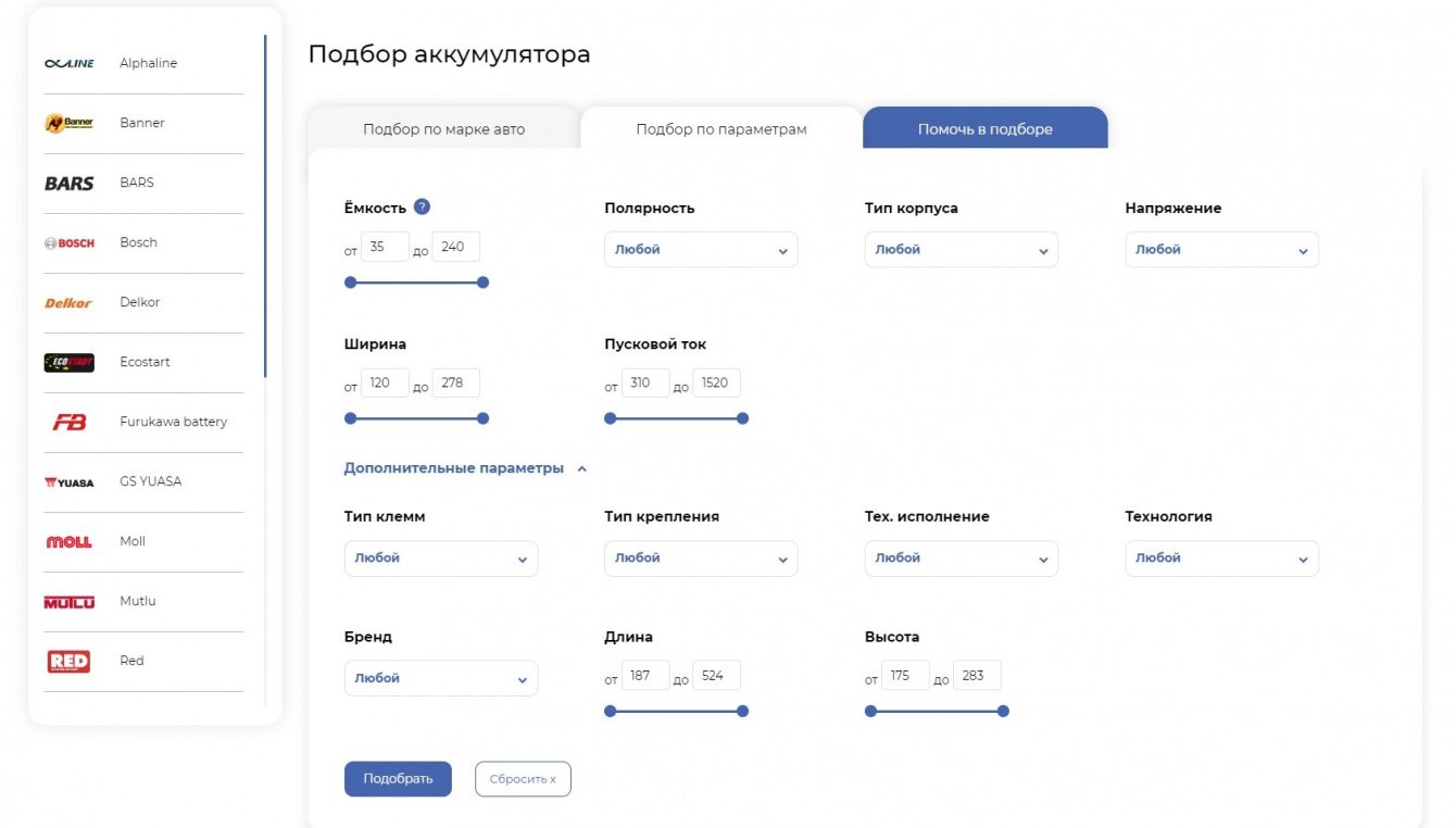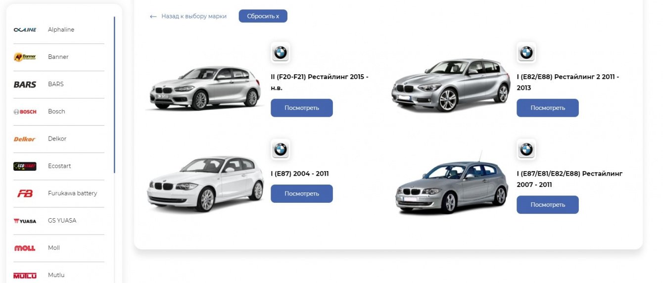 6. Разработан конфигуратор для подбора аккумуляторных батарей по марке авто и параметрам акб;