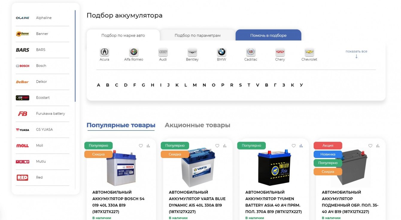 Разработан интернет магазин под ключ с конфигуратором-подбором акб по марке авто и параметрам.