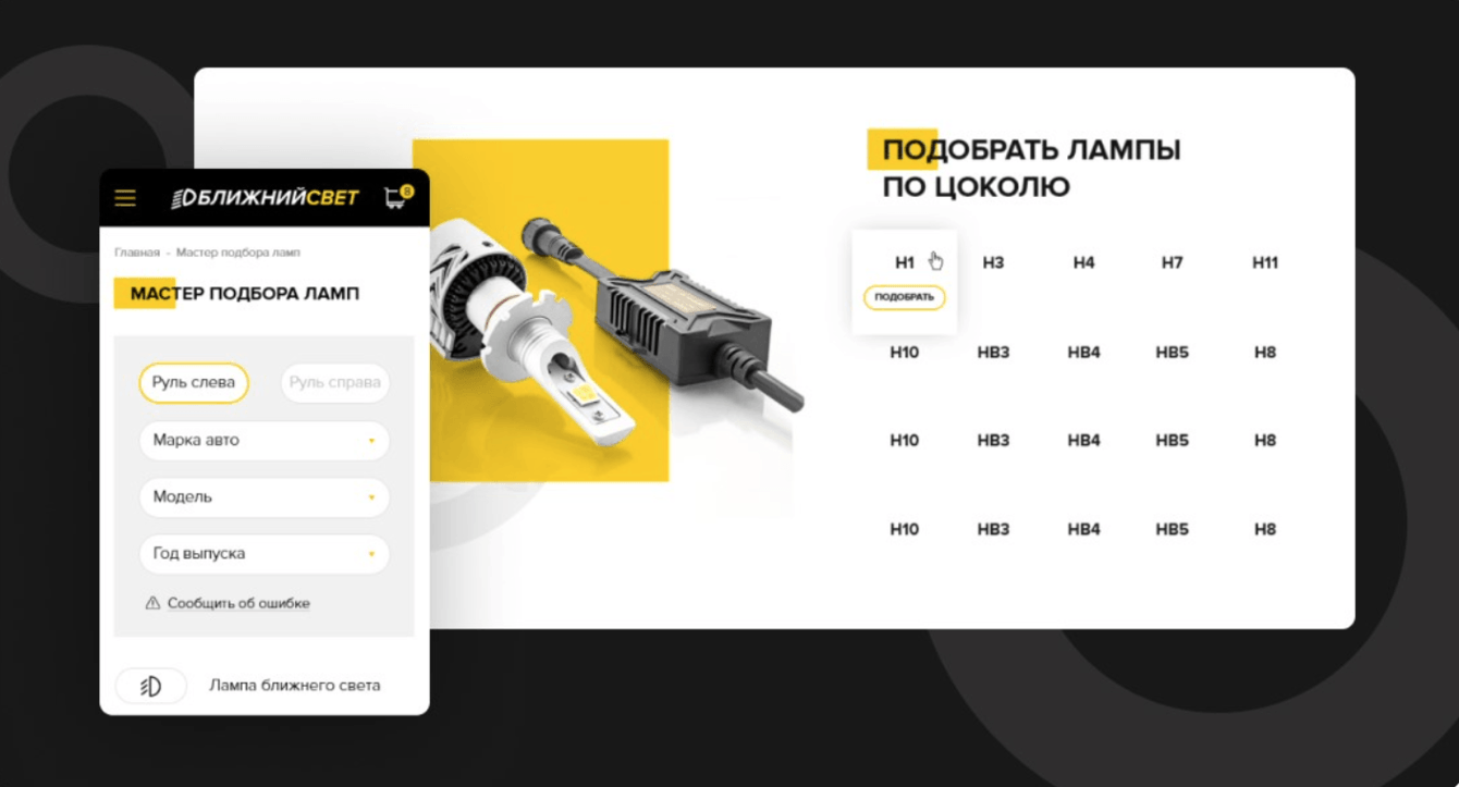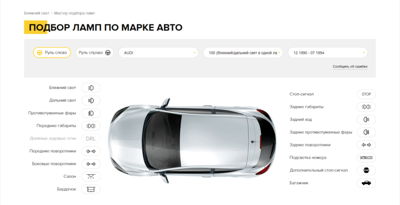 В результате пользователь получает карточку конкретной лампы, которая точно подходит выбранному автомобилю.