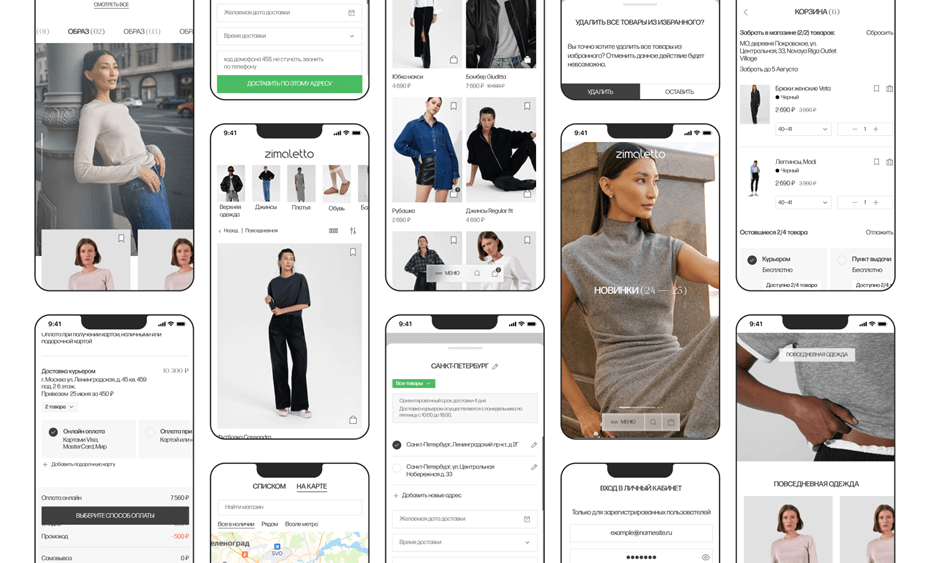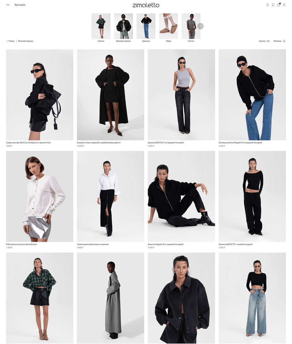 На главной странице вместо большого количества товара размещены подборки, модули с категориями и линиями одежды. Основное UX-решение — крупные, яркие образы, внимание к заголовкам и минималистичным карточкам товара.