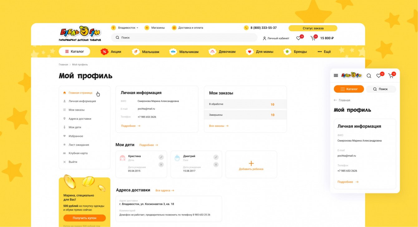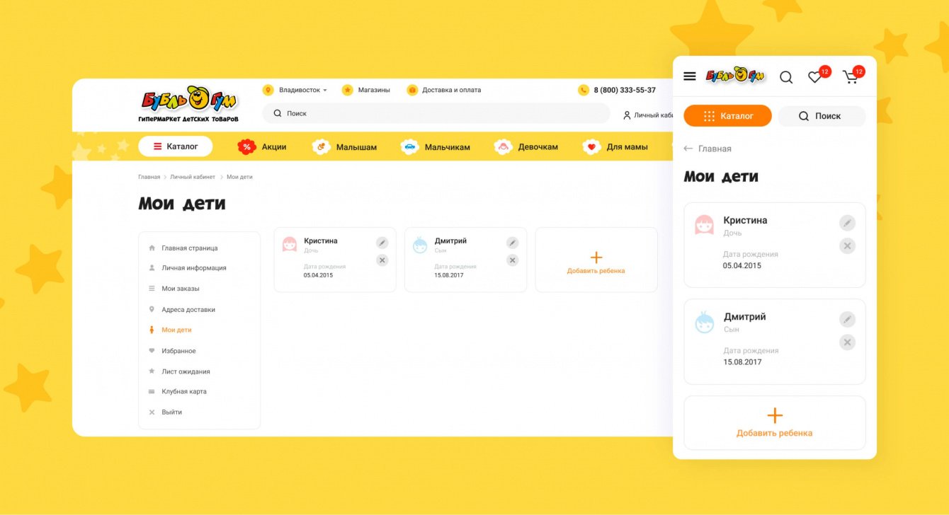 - В личном кабинете реализован дополнительный маркетинговый инструмент — вкладка «Мои дети», система напомнит пользователю о предстоящем дне рождения ребенка