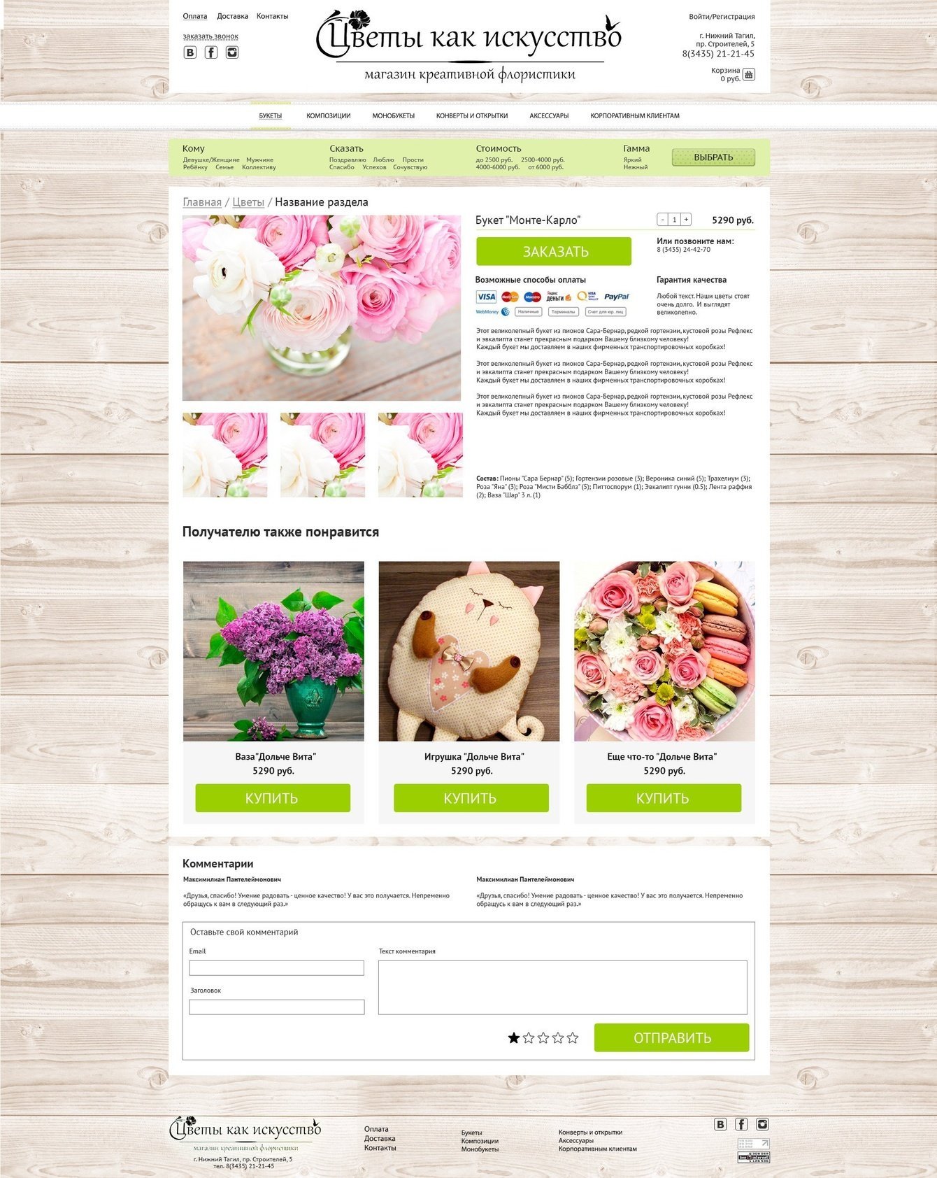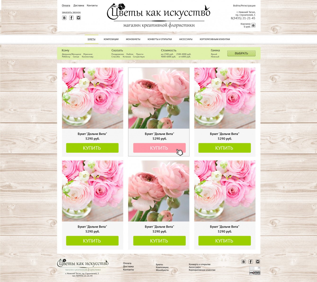 • Разработали концепции дизайна. На основе проведенного исследования был создан макет будущего сайта. Он включал в себя яркие фотографии цветов, удобную навигацию и интуитивно понятные элементы управления.