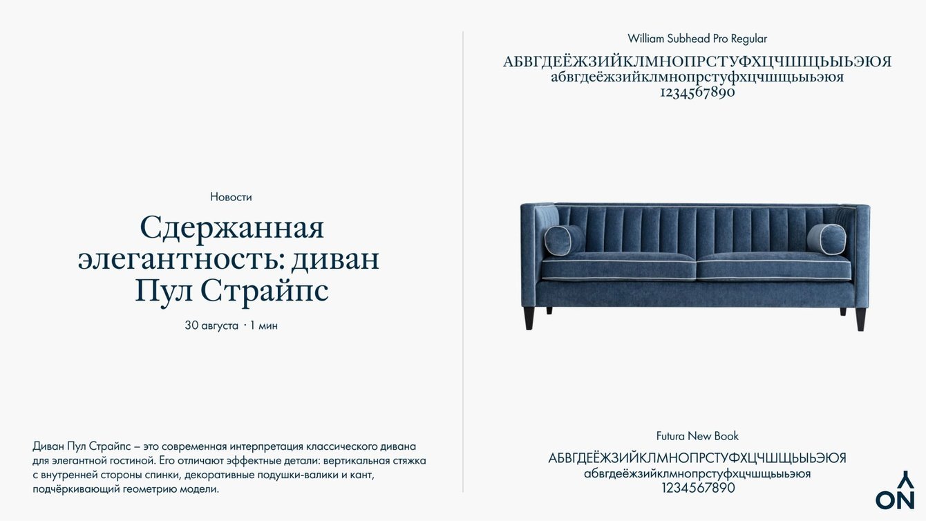 Чтобы подчеркнуть ноты нео-классики, выбрали антиквенный шрифт William в паре с рубленным Futura New.
