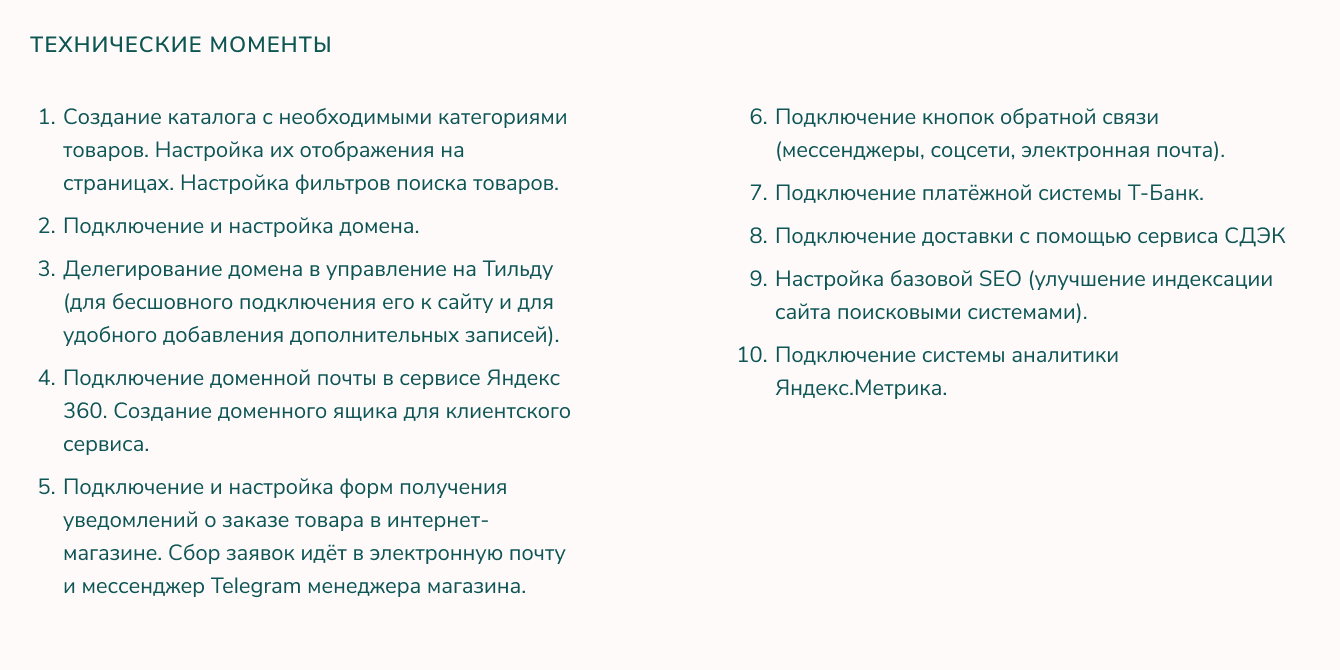 На основании пожеланий, изложенных заказчицей, я составила подробное техническое задание. Внутри ТЗ сделала текстовый прототип в виде таблицы с наименованием каждого блока/страницы , с описанием их наполнения и параллельно предложила свои варианты реализации некоторых моментов (исходя из возможностей Тильды и требований заказчицы).