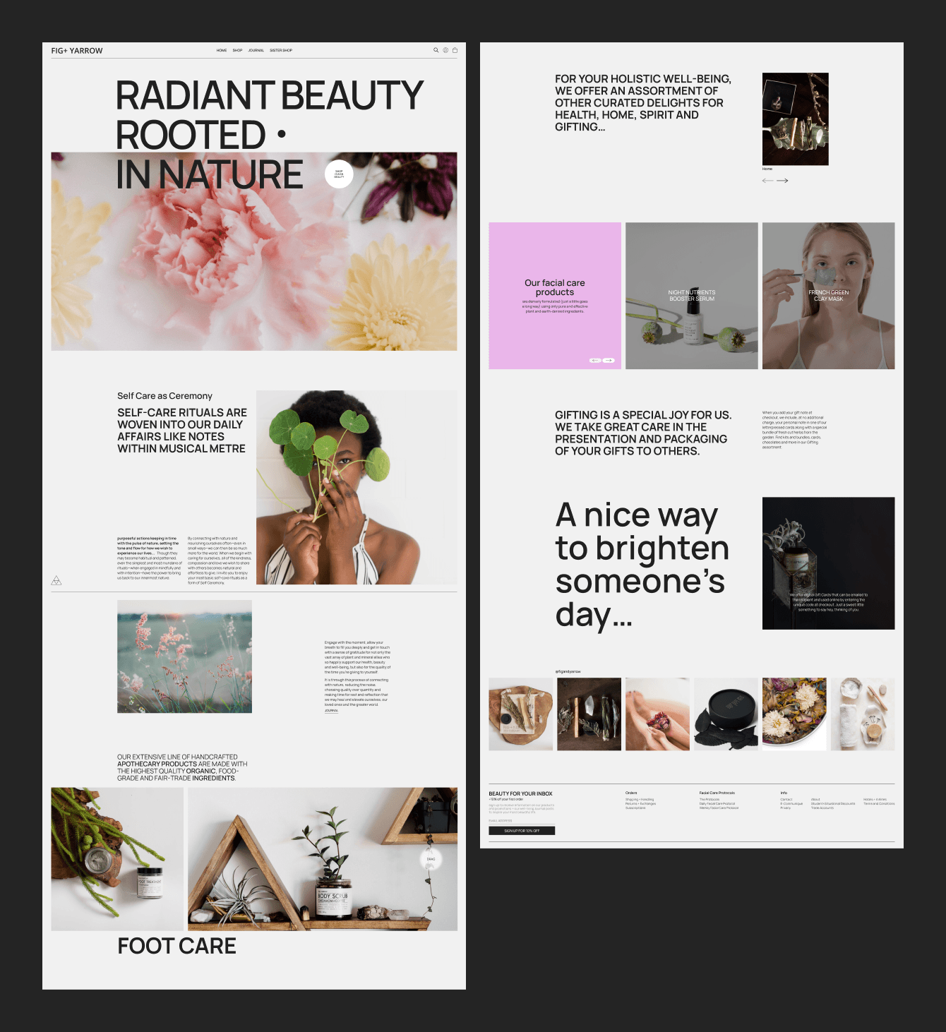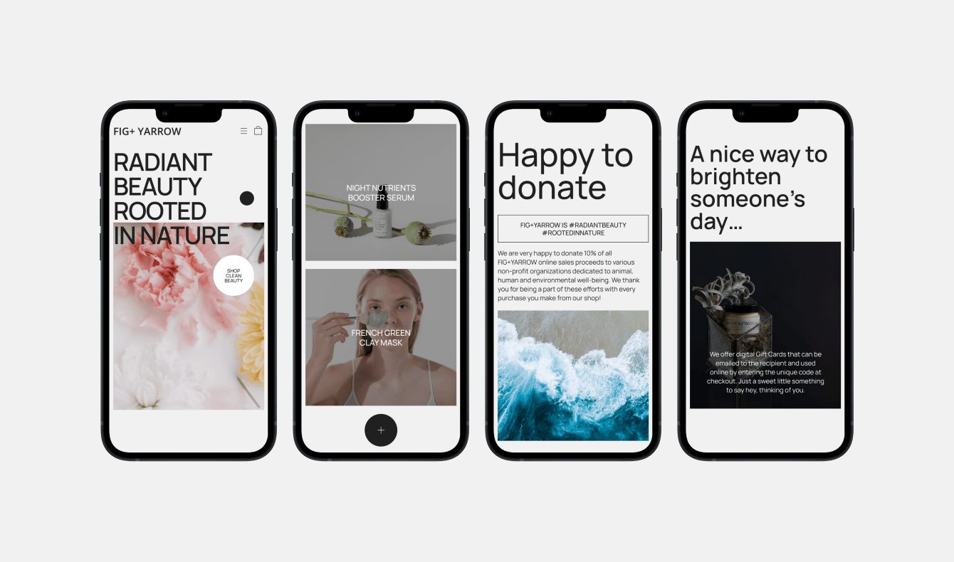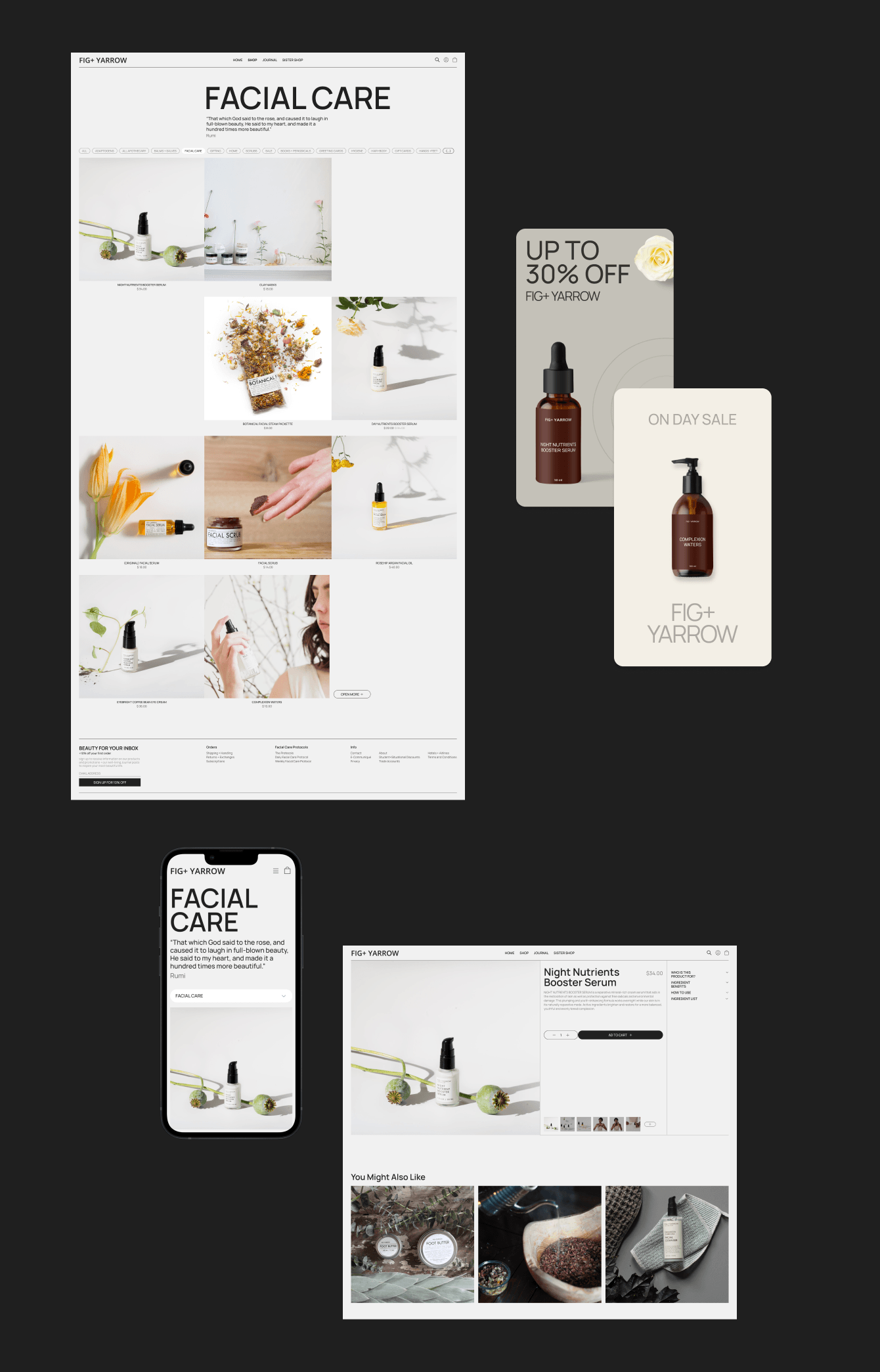 Сделать редизайн интернет-магазина органической натуральной косметики Fig+Yarrow с учетом сохранения его стильного контента. Главная цель — отразить преимущества и особенности косметики, чтобы посетители могли полноценно познакомиться с продукцией.