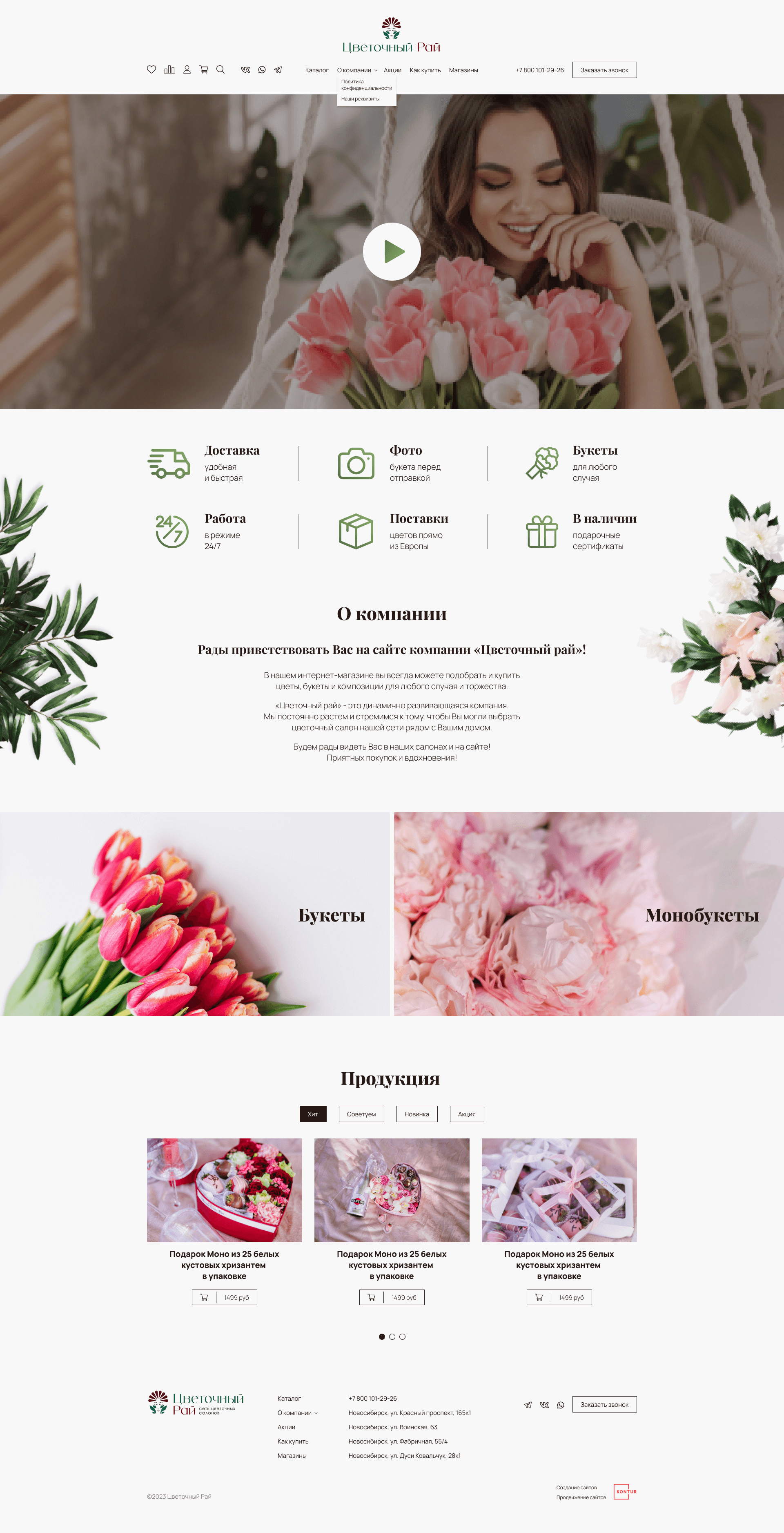 После ознакомления с деталями проекта, наши специалисты приступили к отрисовке индивидуального дизайна. Макет получился лаконичным и удобным, в черно-белых цветах. Основной упор был на профессиональные фотографии цветов и композиций.