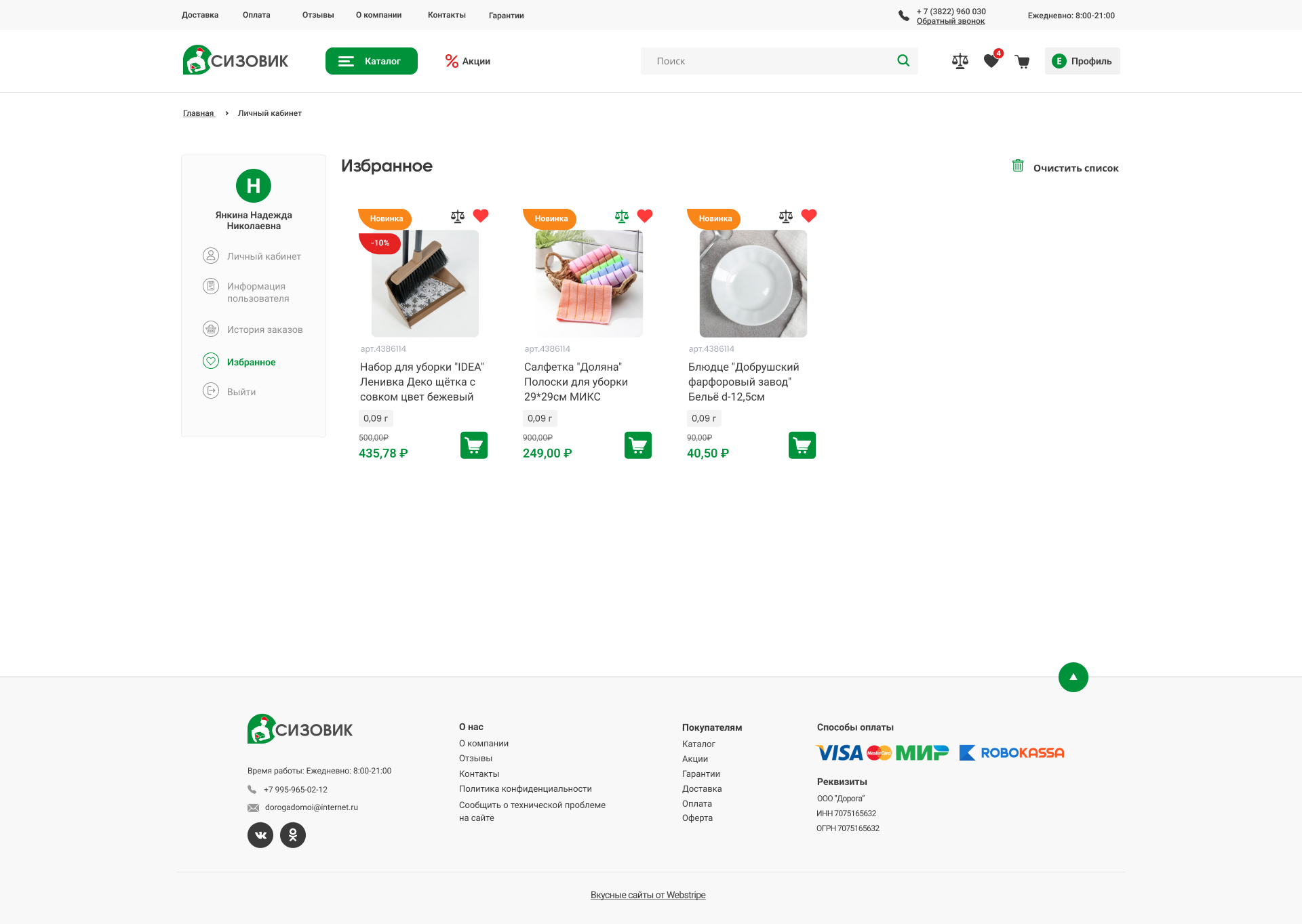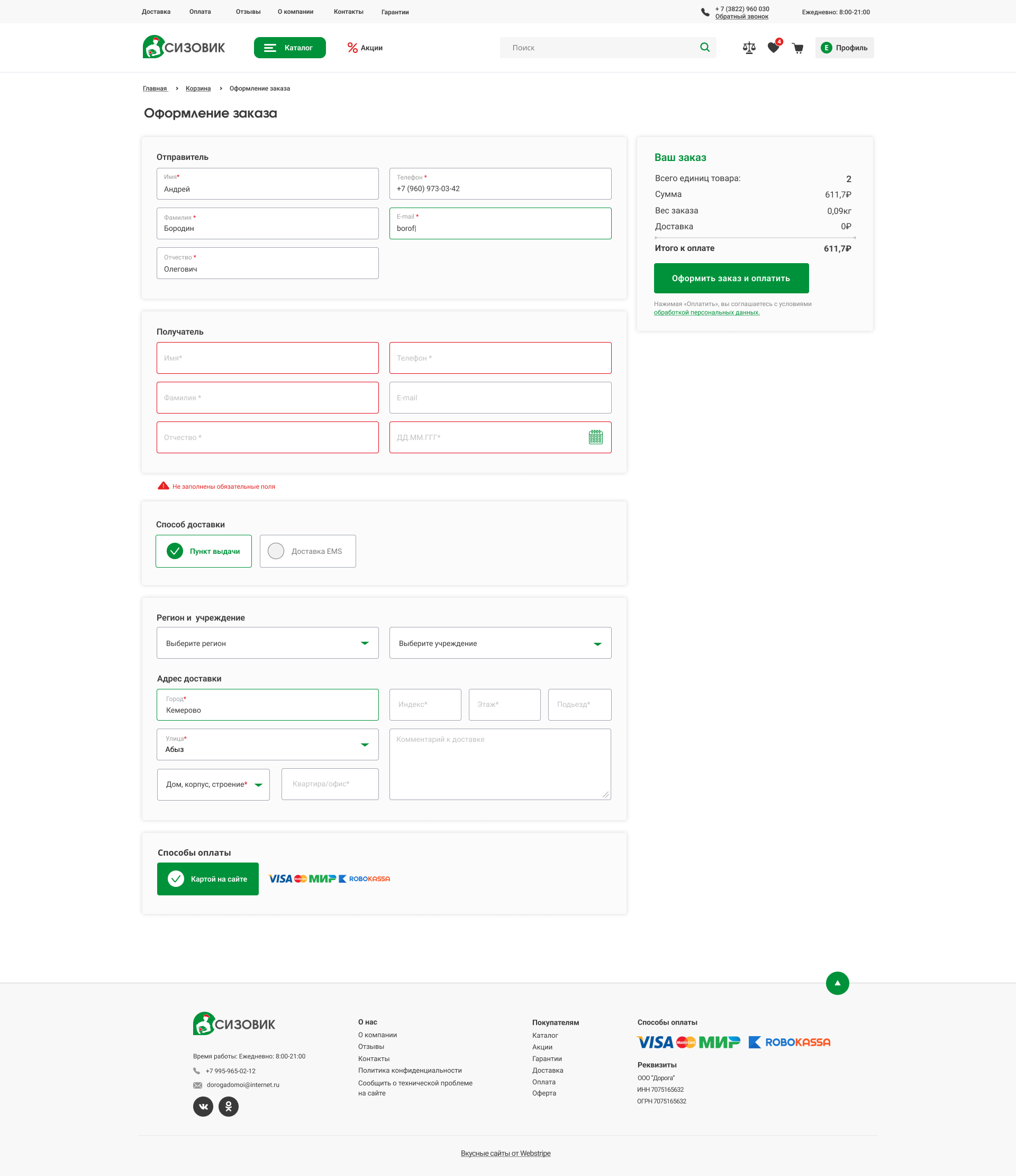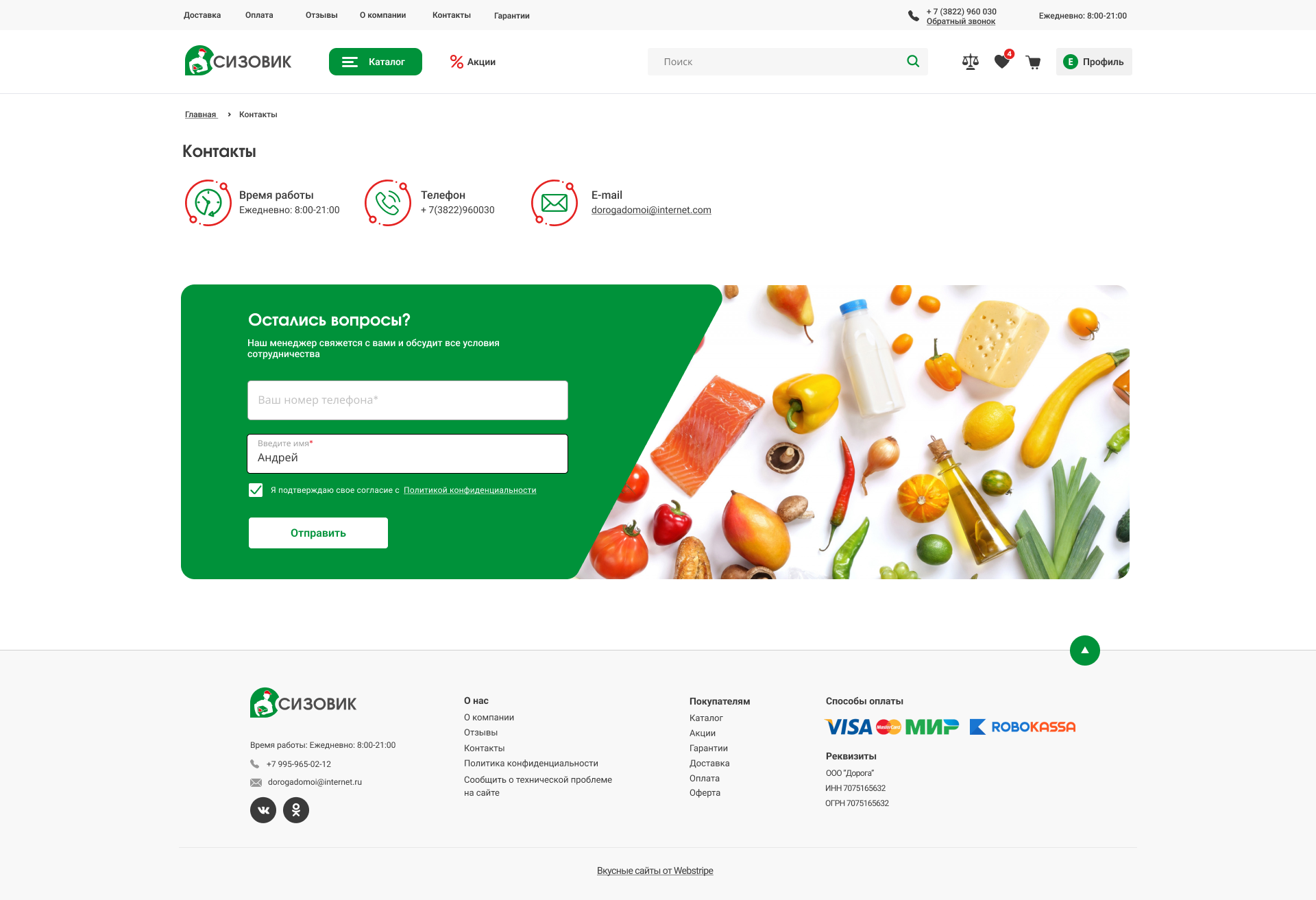 Подключение интернет-эквайринга, интеграция с 1С УТ, Почтой России и SMS;