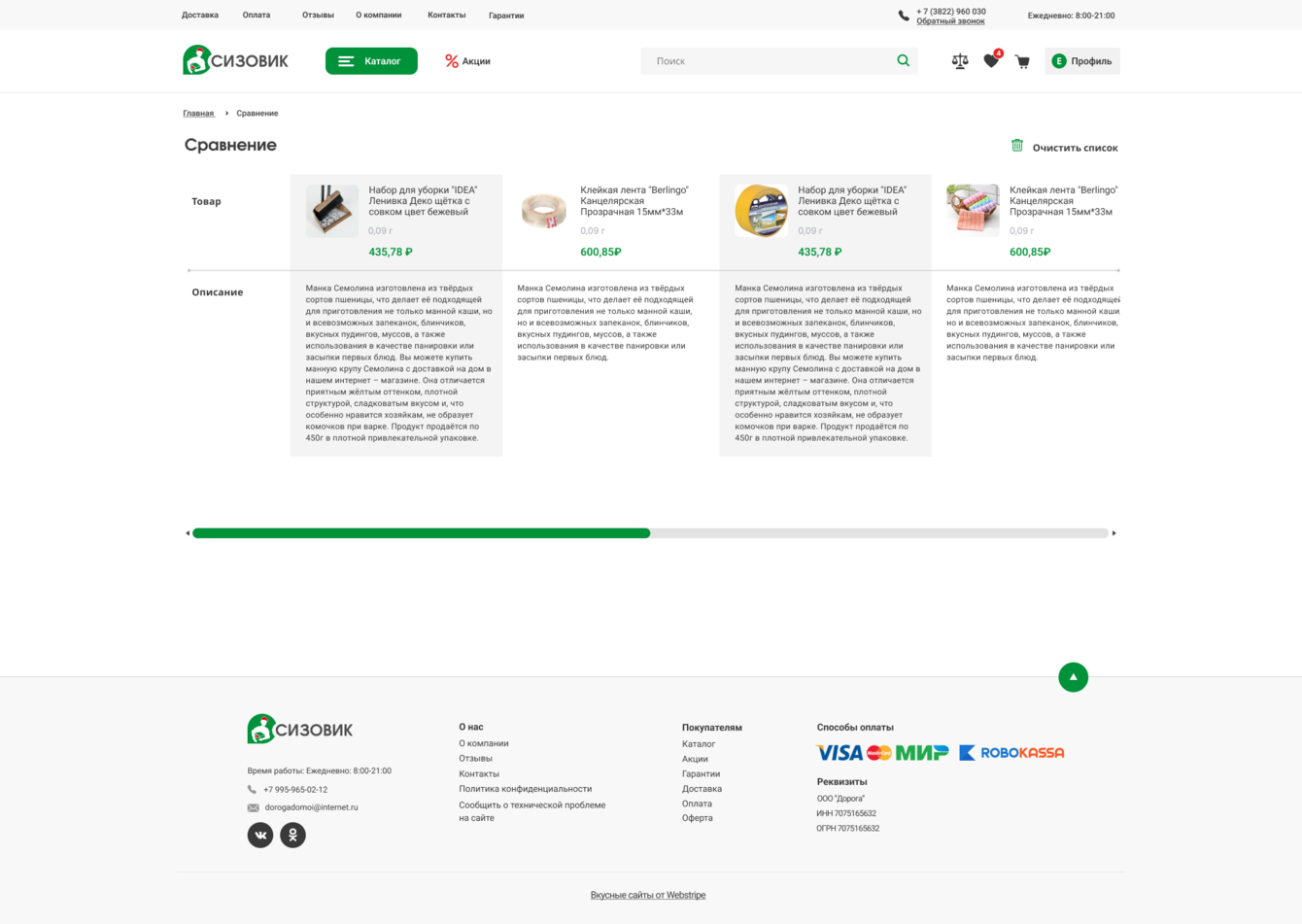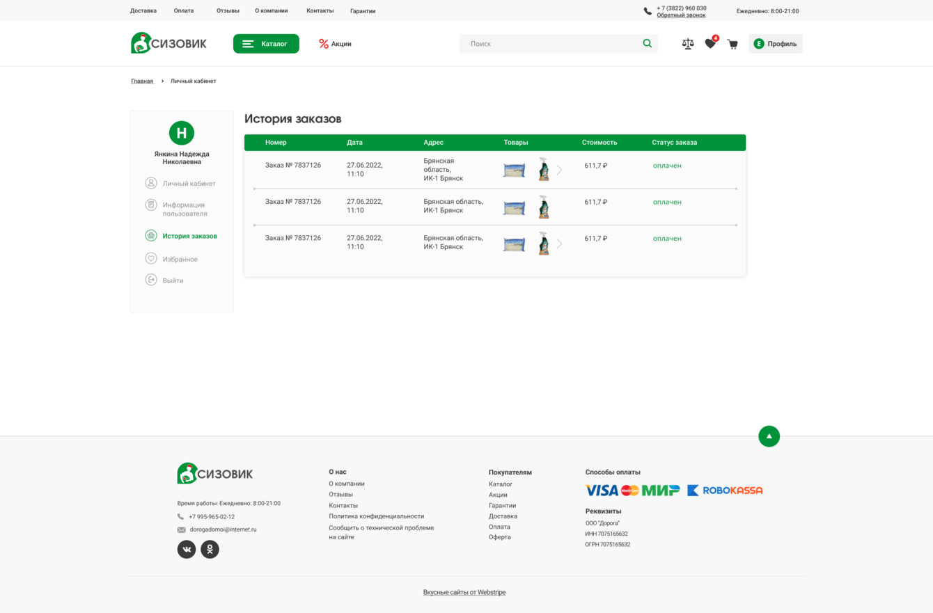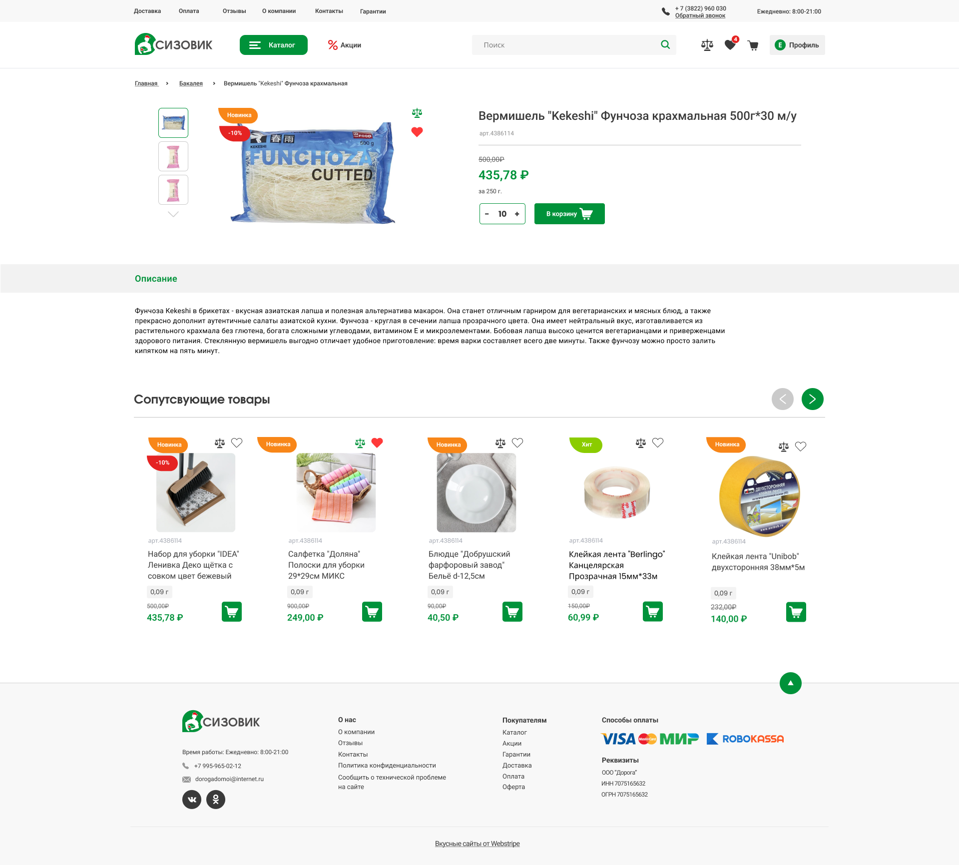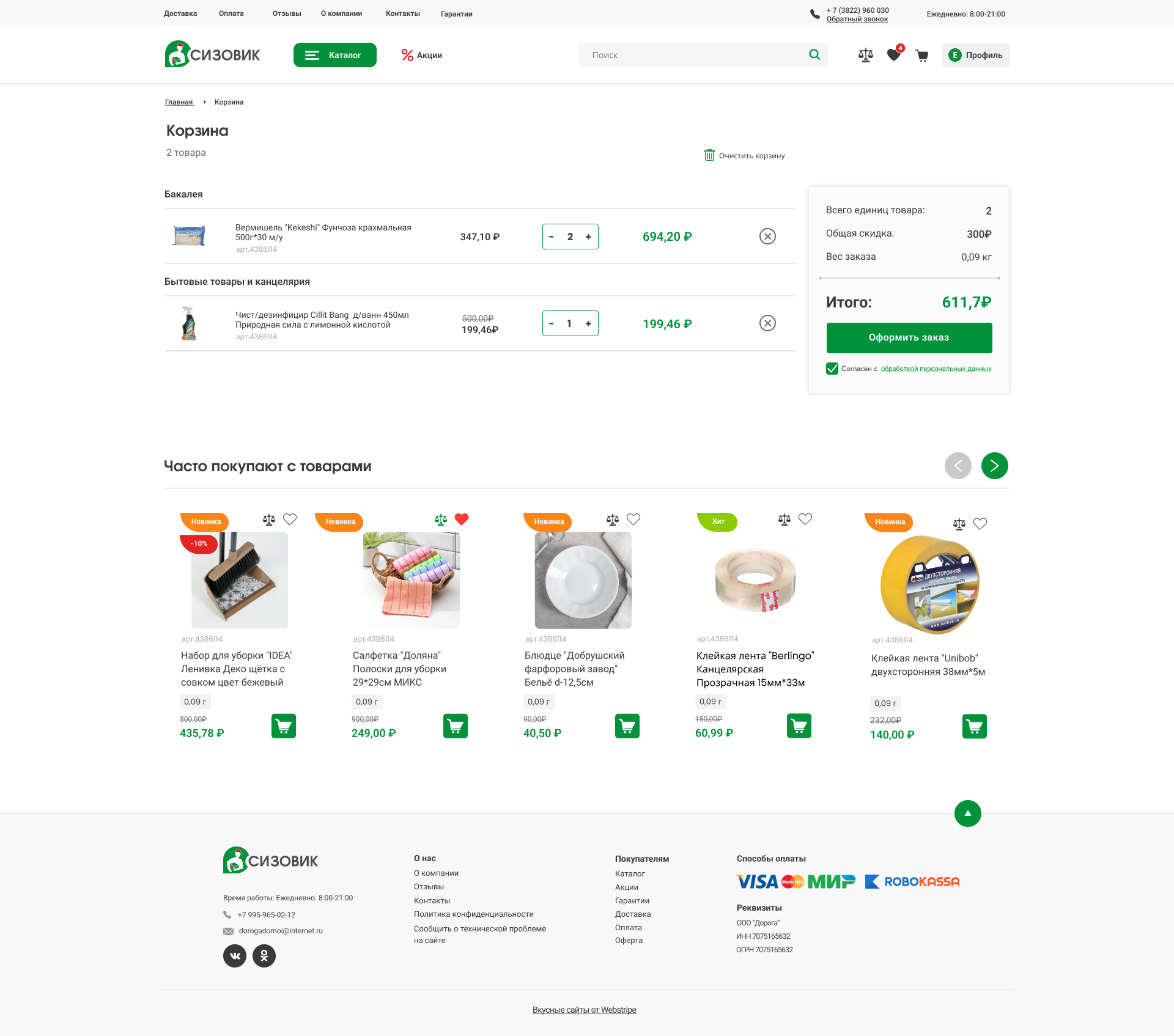 Подключение интернет-эквайринга, интеграция с 1С УТ, Почтой России и SMS;