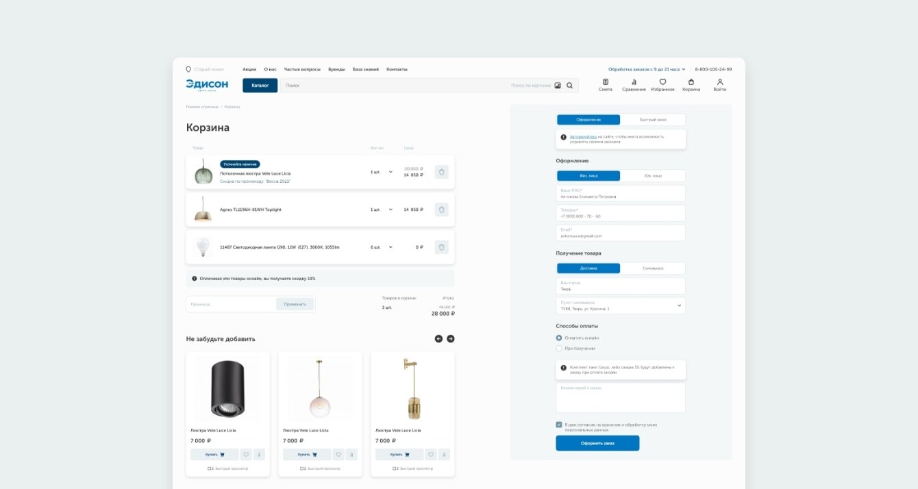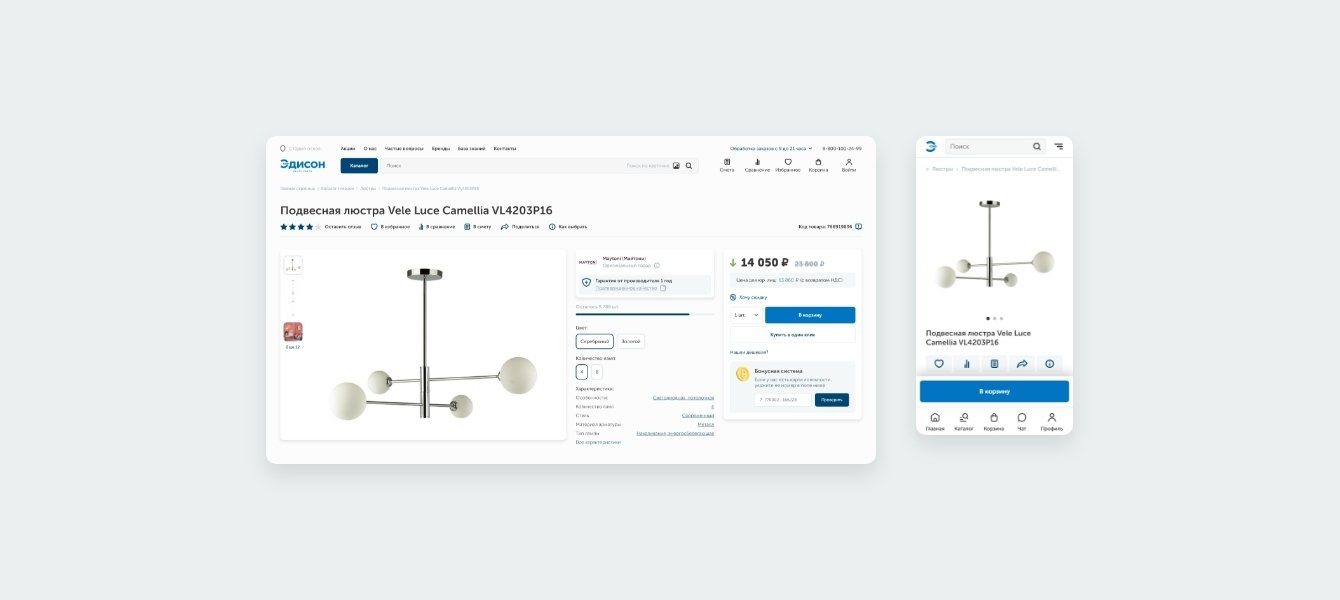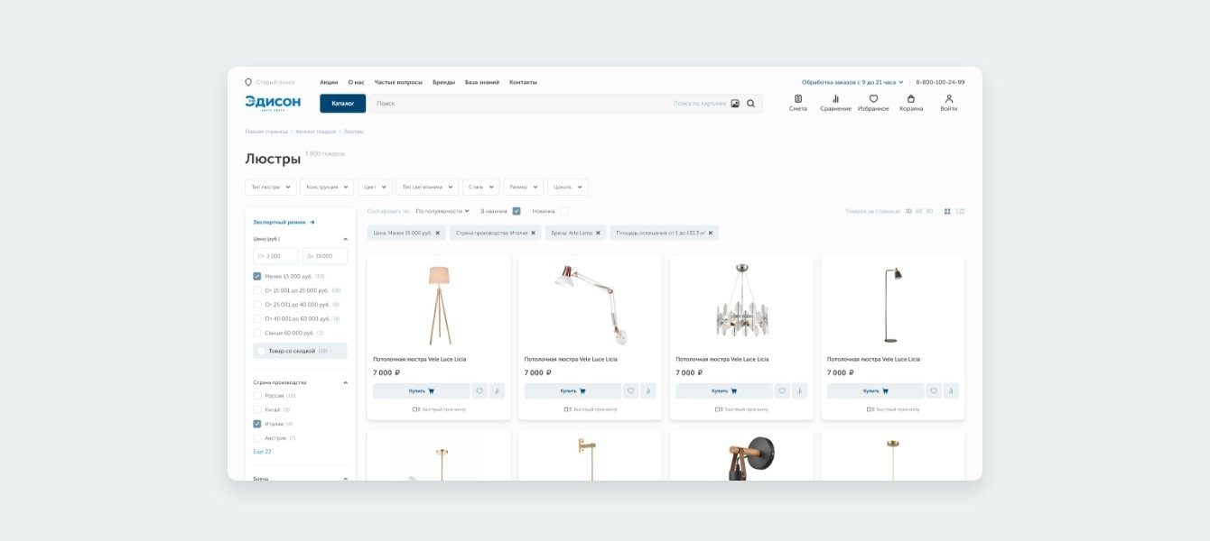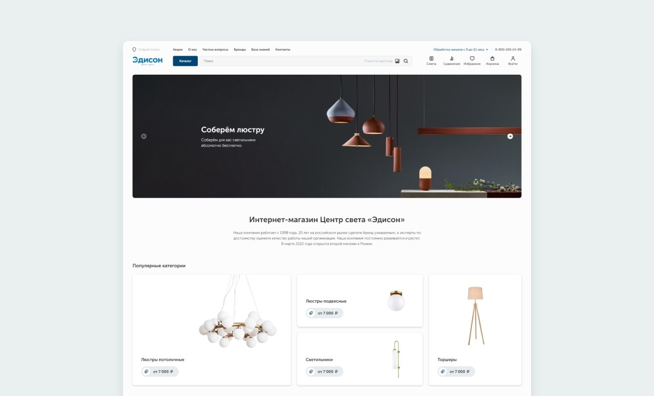 С 2019 года мы вместе с компанией «Эдисон» совершенствуем интернет-магазин и внутренние сервисы компании. В 2023 году мы сделали уже второй редизайн основного сайта. Улучшили интерфейс и добавили новые возможности, как для посетителей интернет-магазина, так и для сотрудников компании