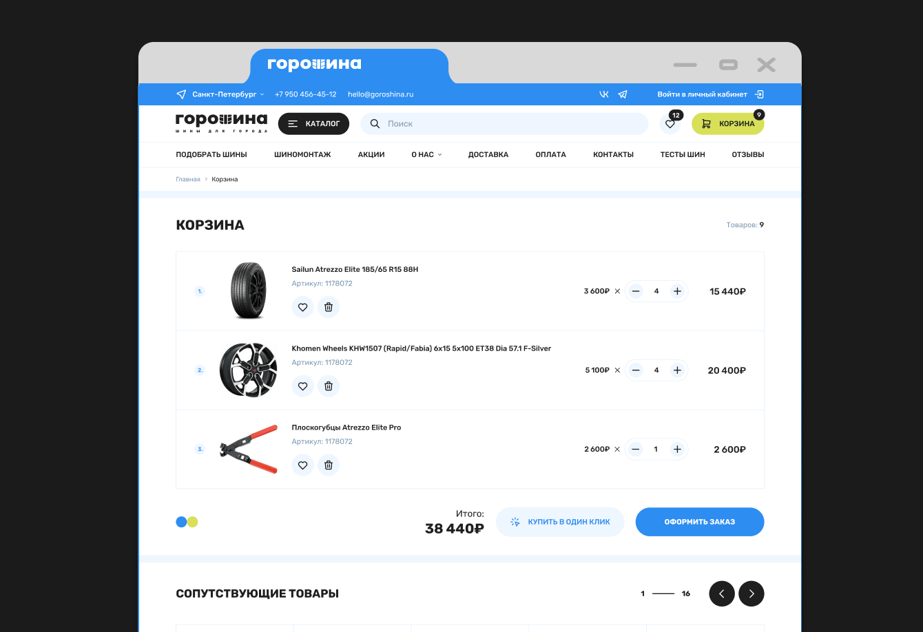 Нам предстояло с нуля создать платформу, где пользователи смогут не просто смотреть ассортимент и делать заказы, но и подбирать шины под модель автомобиля. Кроме того, сайт должен быть готов к росту бизнеса. «Горошина» постоянно расширяет каталог, поэтому нужен интернет-магазин, который справится с растущей нагрузкой.