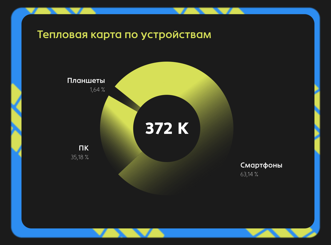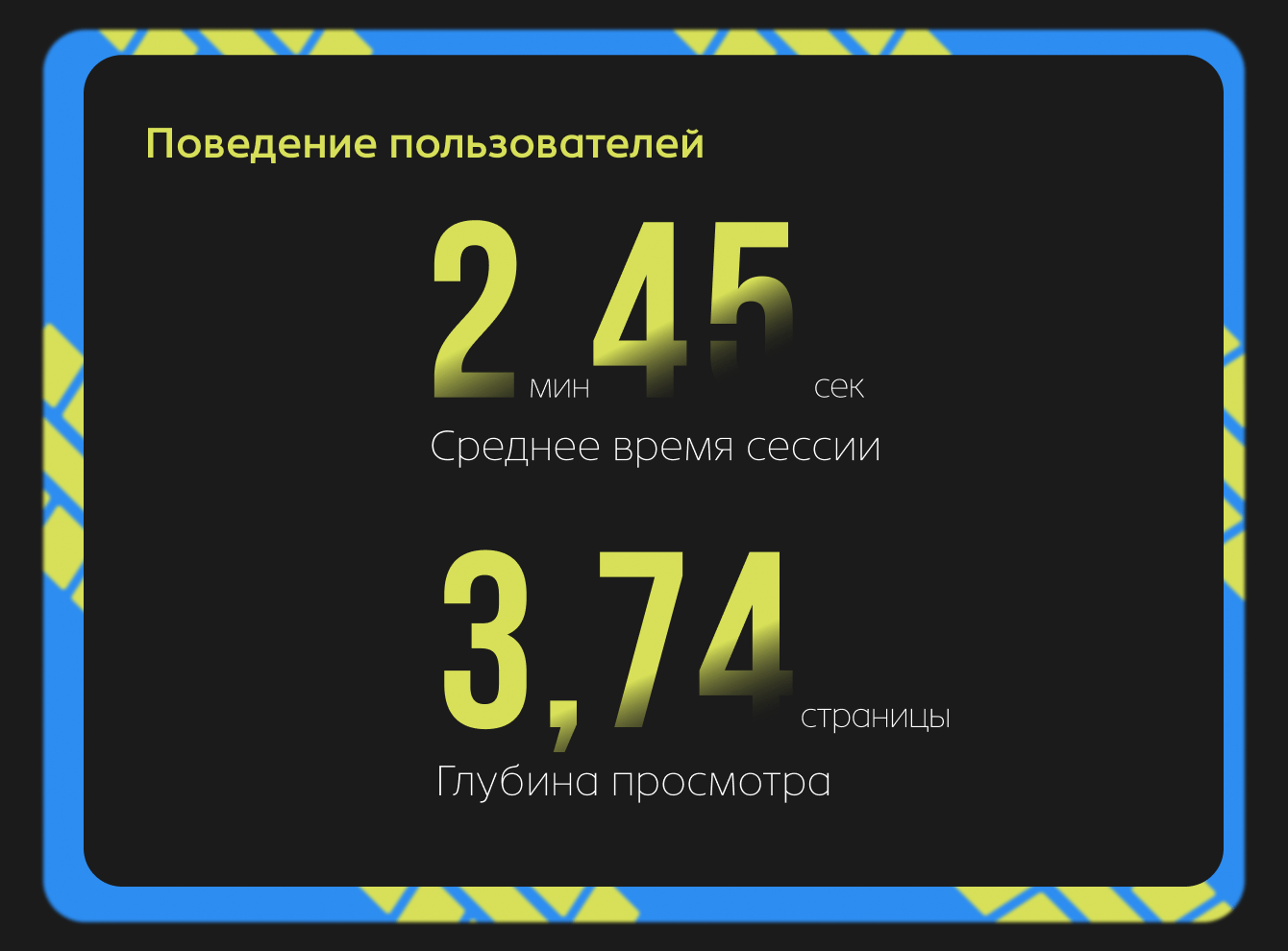 Поведение. Метрики подтверждают качество UX-решений. Среднее время сессии составляет 2 минуты 45 секунд, а глубина просмотра — 3,74 страницы за визит. Сайт удерживает внимание пользователей, и они активно взаимодействуют с каталогом и сервисами.