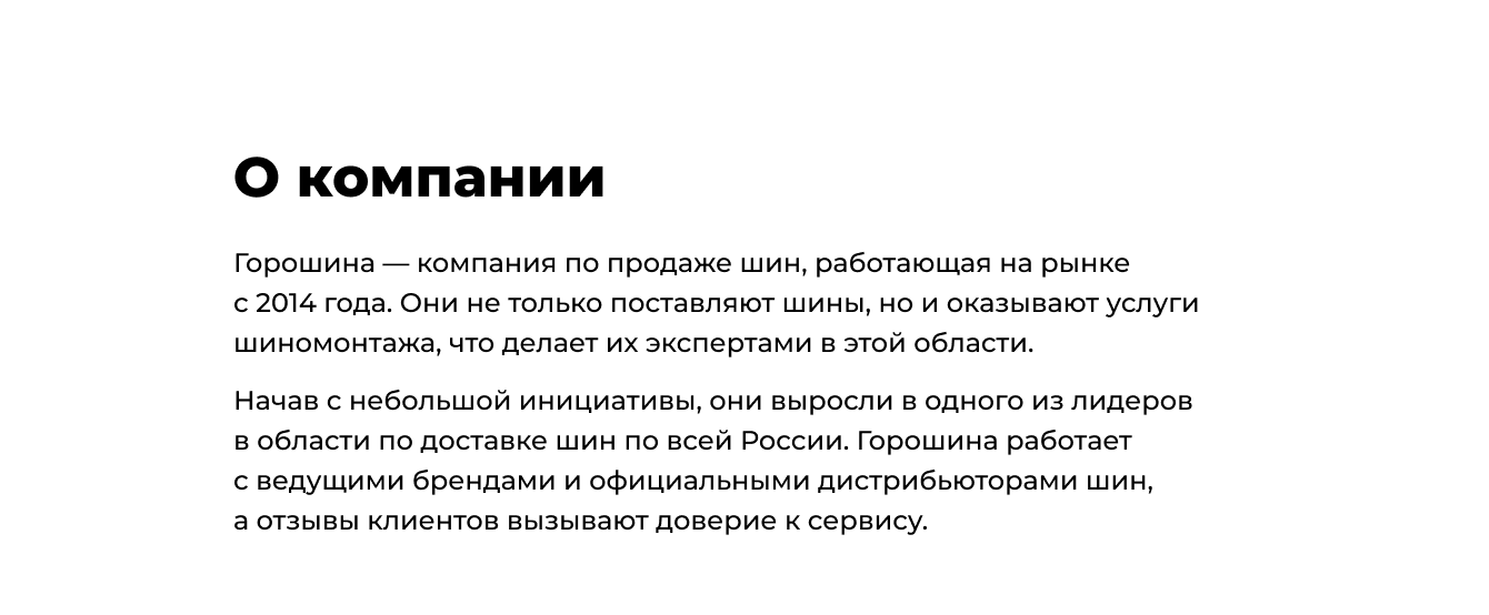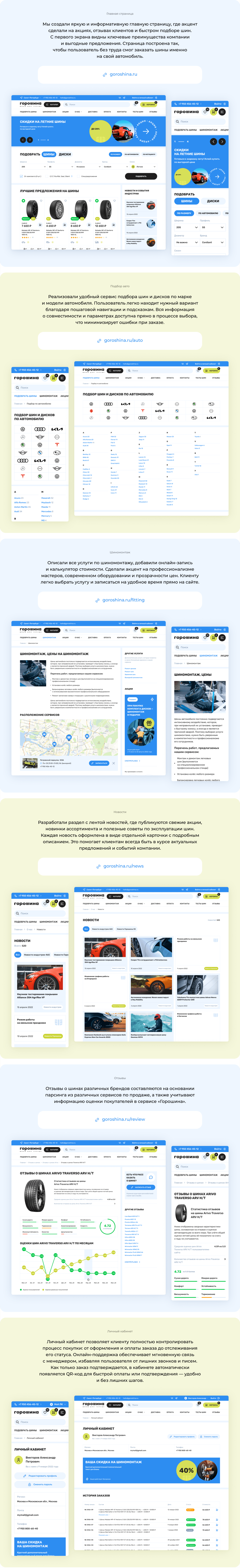 Проект «Горошина» — это пример того, как современный подход к дизайну, функционалу и поддержке позволяет создать уникальный продукт, который выделяется на фоне других интернет-магазинов шин и дисков. Мы гордимся результатом и продолжаем работать над тем, чтобы сайт приносил клиенту максимальную пользу и оставался актуальным для пользователей.