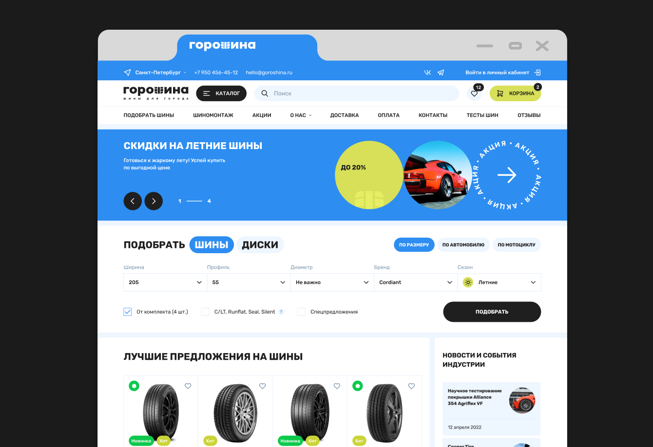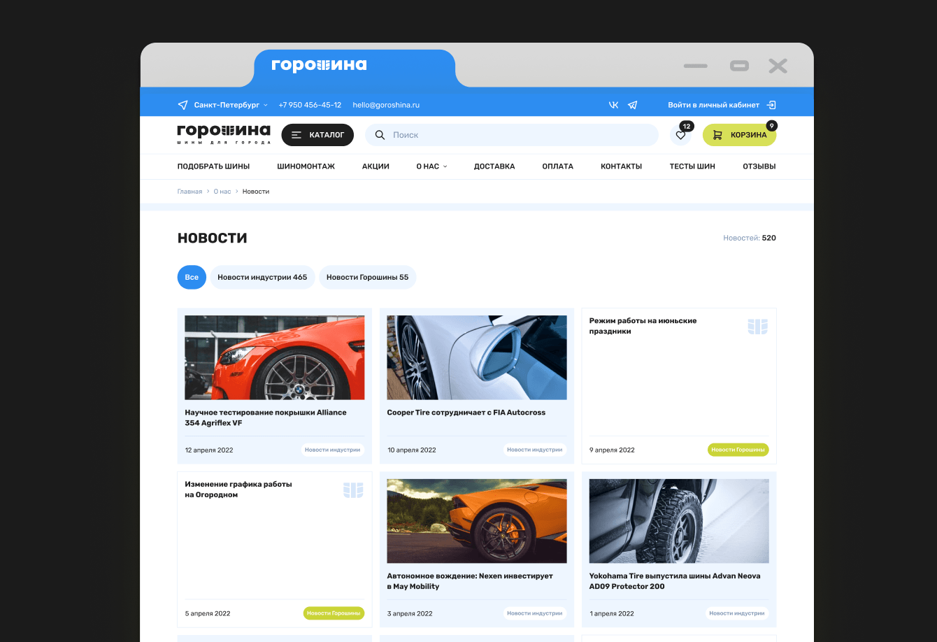 Новости. Мы разработали раздел с новостной лентой, где публикуются свежие акции, новинки ассортимента и полезные советы по эксплуатации шин. Каждая новость оформлена в виде отдельной карточки. Модуль помогает компании поддерживать экспертную репутацию в глазах клиентов, а клиентам — быть в курсе актуальных предложений магазина и событий шинной индустрии.