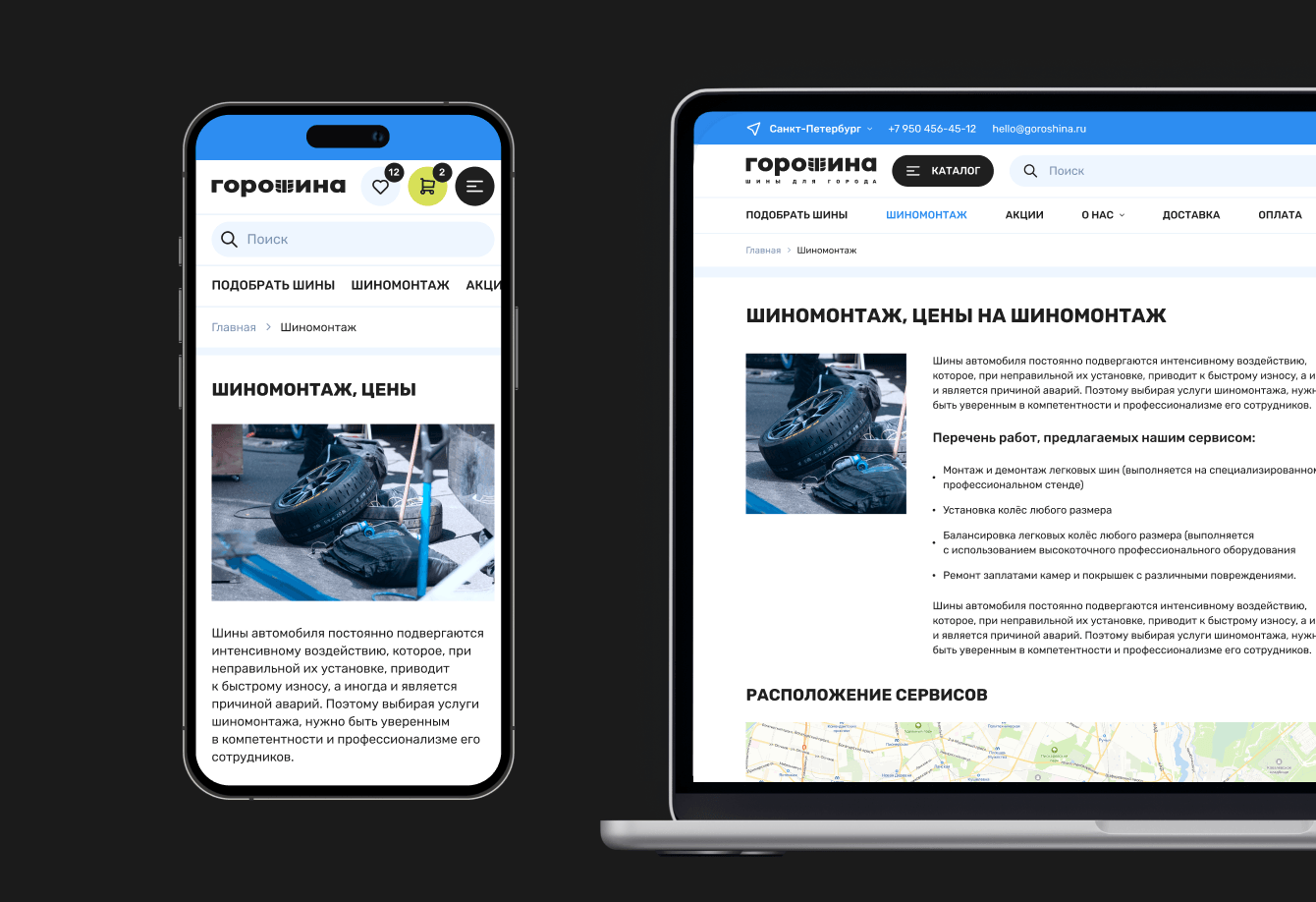 К нам обратилась компания «Горошина» — крупный поставщик автомобильных шин и дисков, который работает на российском рынке с 2014 года. Заказчик сотрудничает с ведущими брендами и дистрибьюторами, а также оказывает услуги шиномонтажа. Одним словом, это команда признанных экспертов в своей отрасли.