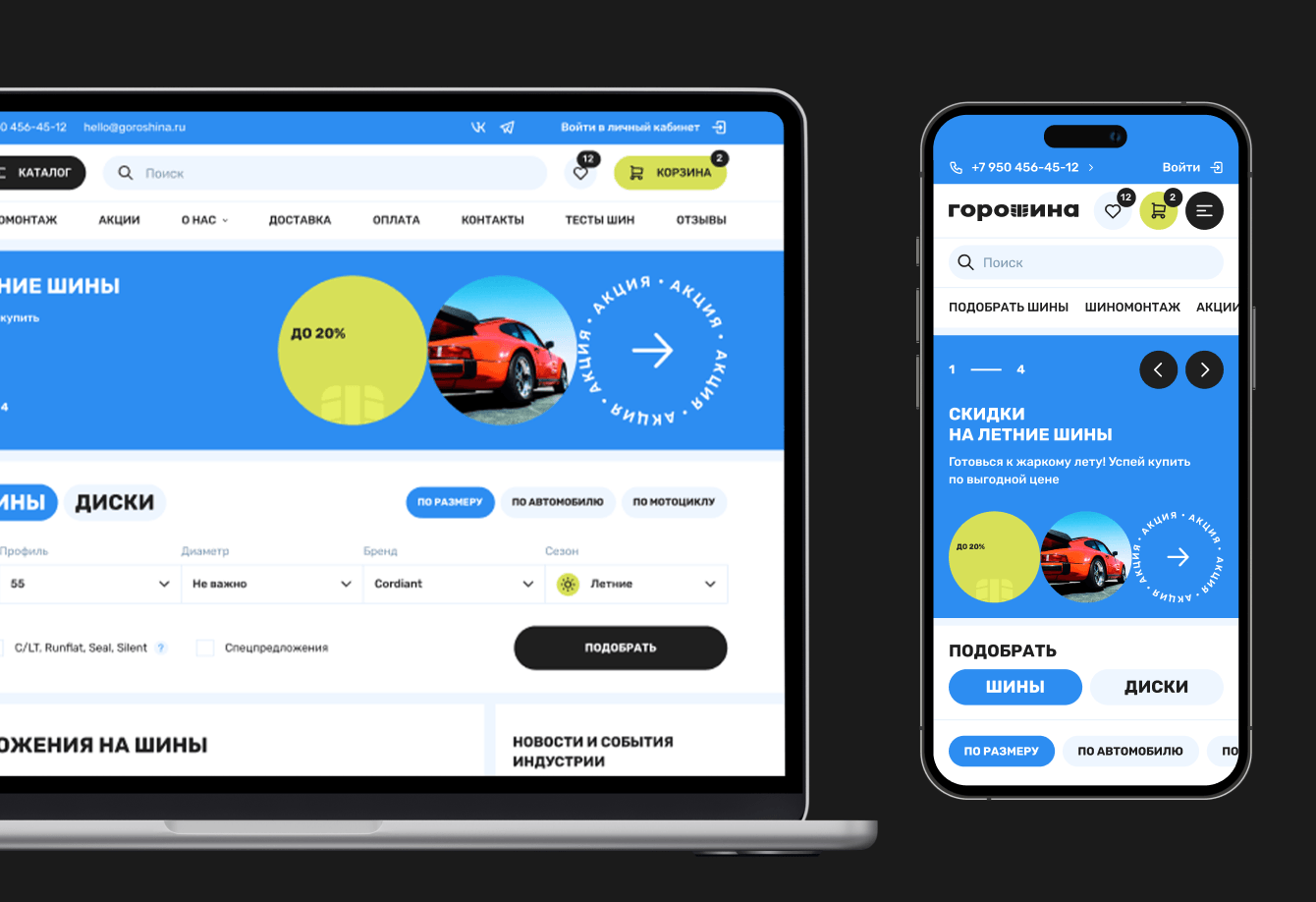 В финале проекта заказчик получил полноценную онлайн-платформу для продаж и управления ассортиментом. При этом современный подход к дизайну выделяет сайт «Горошины» на фоне других интернет-магазинов шин и дисков.