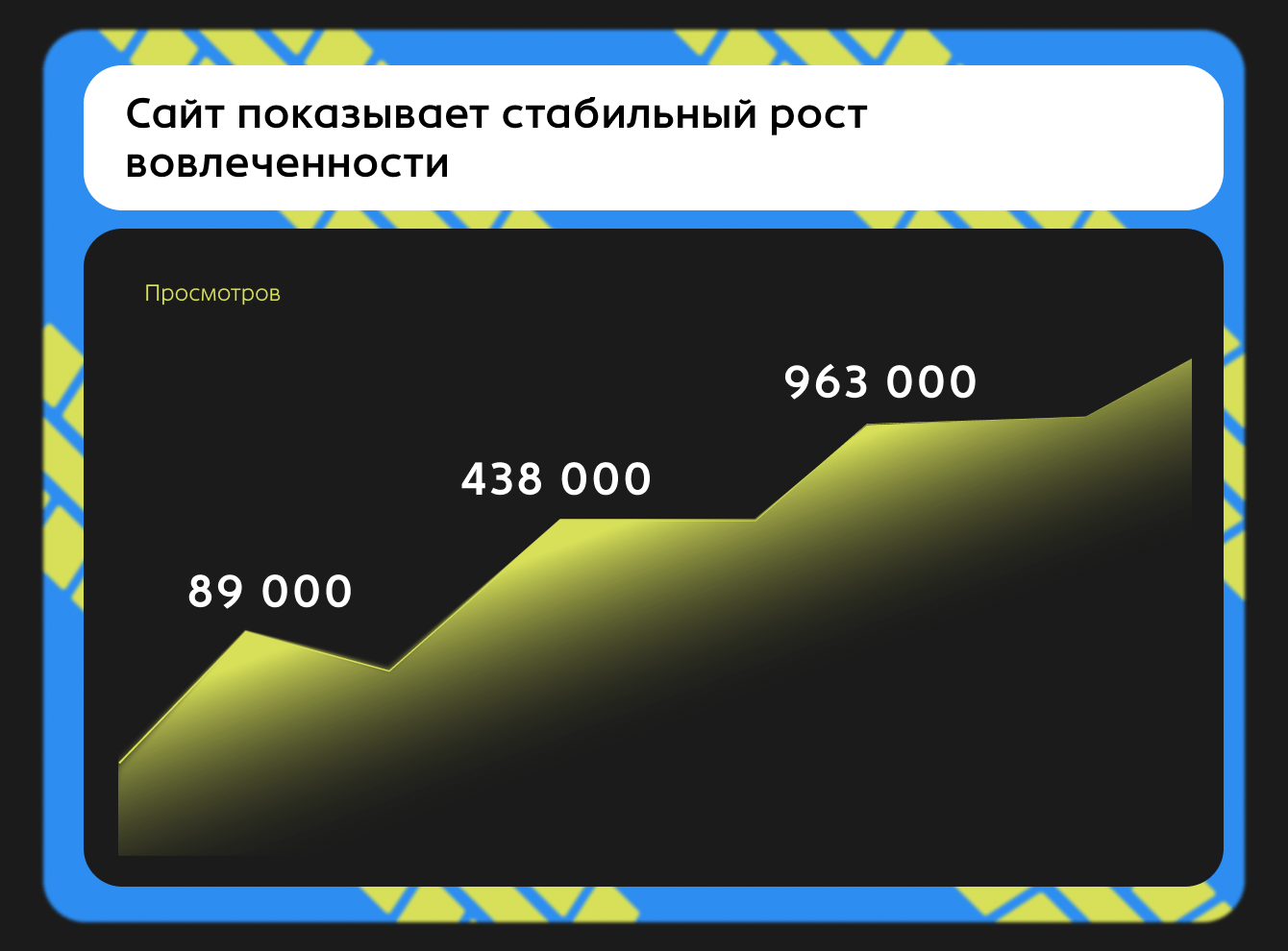 Трафик. Сайт показывает стабильный рост вовлеченности. С момента запуска платформа собрала 963 000 просмотров страниц. При этом было 285 000 уникальных посетителей, а 37 000 пользователей возвращались снова.