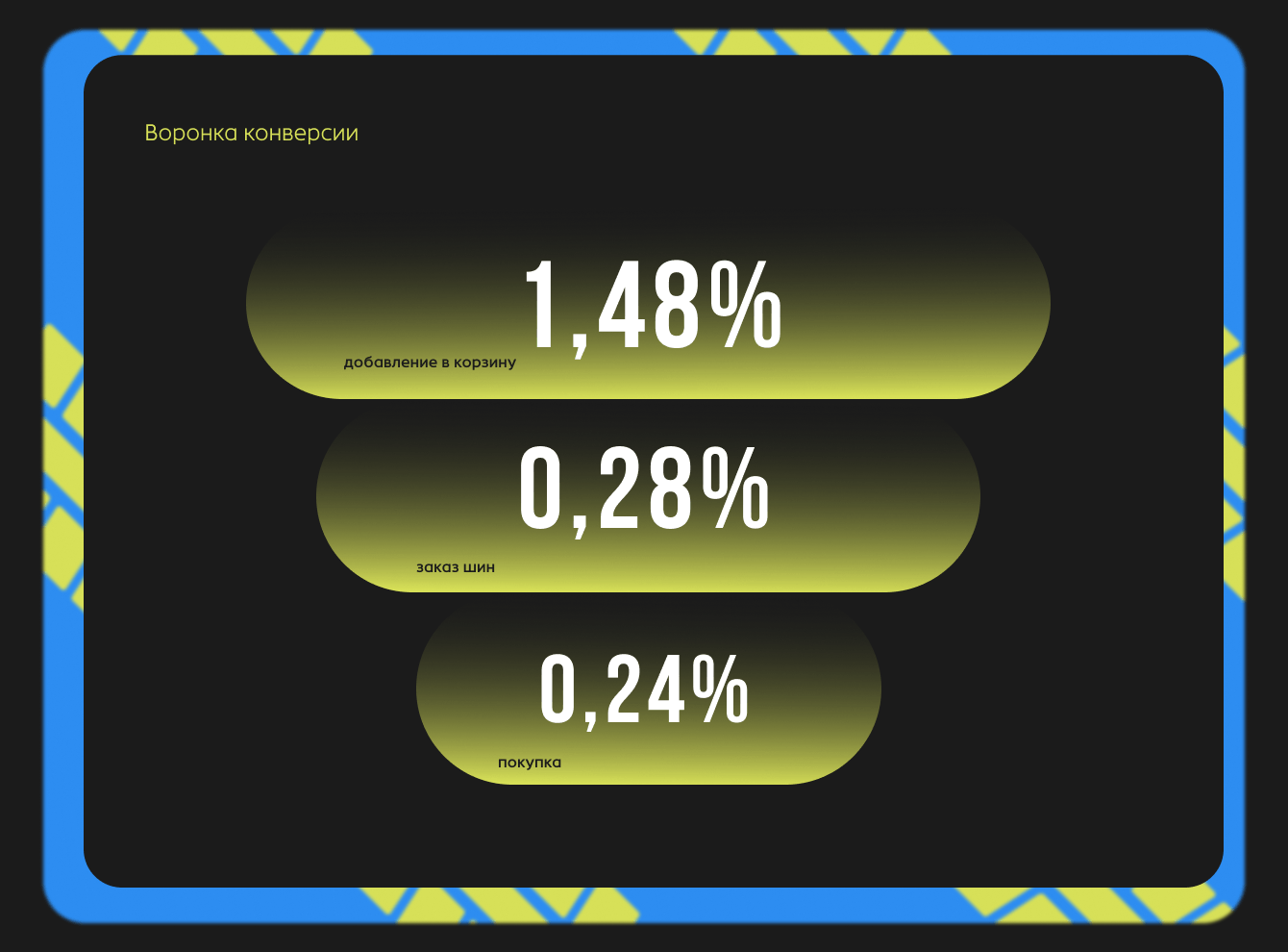 Функционал. Анализ тепловых карт фиксирует интерес к основным пользовательским сценариям. Вот самые востребованные страницы: главная — 85 100 взаимодействий, подбор шин по авто — 20 700, калькулятор услуг шиномонтажа — 18 400. Наши разработчики корректно реализовали продуктовую логику сайта: быстрый подбор и удобную покупку.