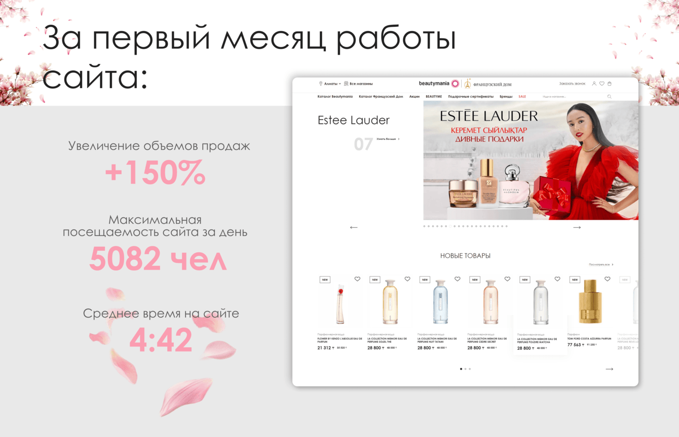 • После запуска нового проекта увеличилась конверсия, глубина просмотра, время, проведенное на сайте, и уменьшились отказы по сравнению с прошлым сайтом. Благодаря этому продажи выросли на 150 %, то есть в 2,5 раза.