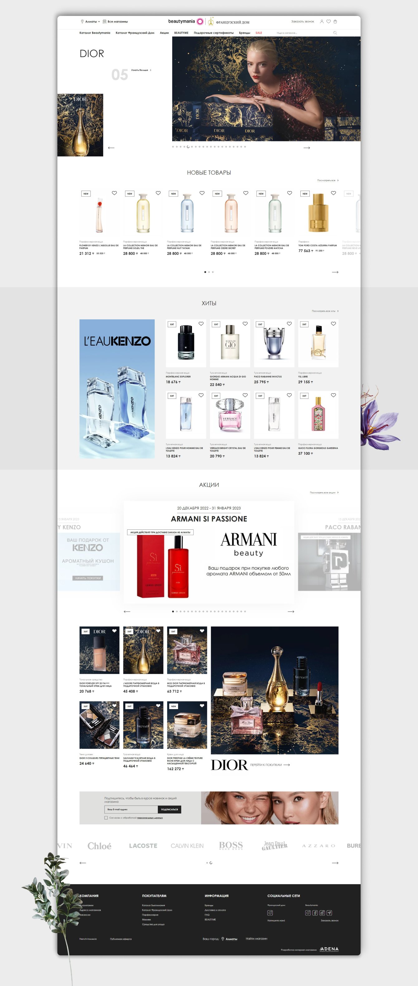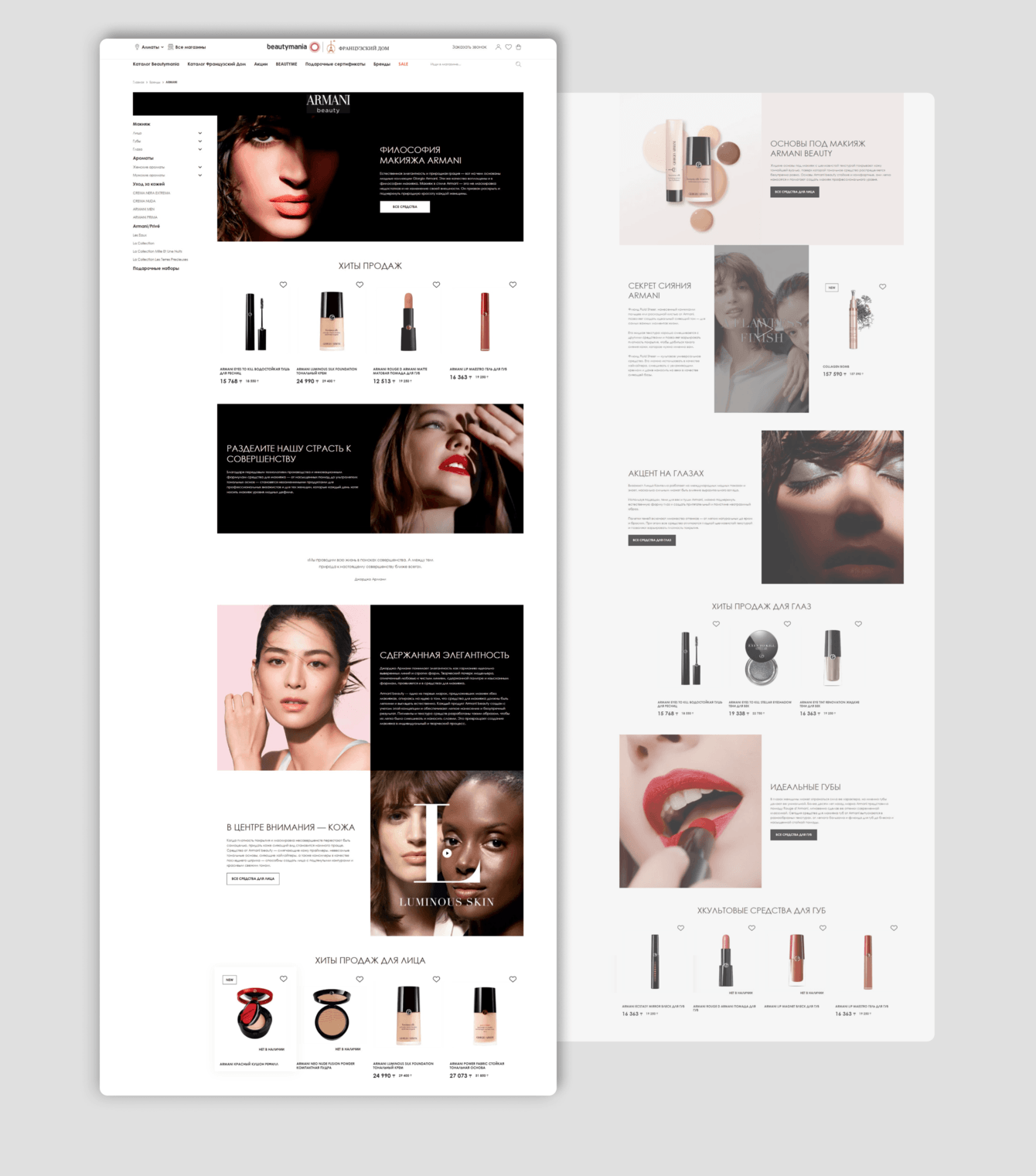 — Для некоторых брендов были разработаны отдельные лендинги. Причем они создавались индивидуально под каждый бренд и вид косметики. К примеру, у Armani отдельно создавались страницы средств для макияжа, уходовых кремов и парфюмерии. Здесь описана история бренда, есть видео о продукции, выделены хиты продаж. Все это сделано для того, чтобы подчеркнуть статусность и уникальность каждого бренда