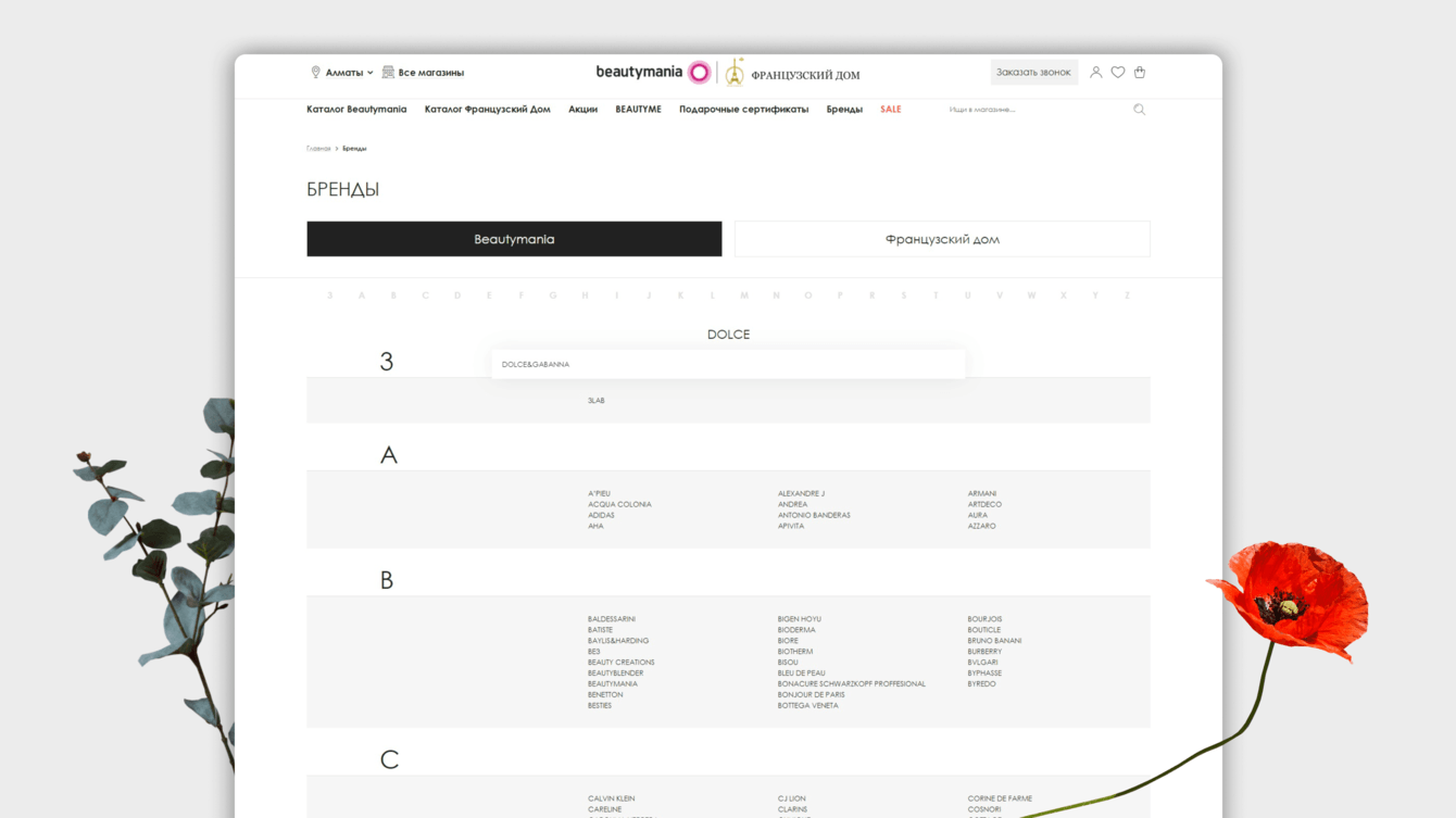 — Так как на сайте 2 каталога, на странице списка брендов также было сделано разделение. При выборе Французского Дома выводятся одни бренды, при клике на Beautymania — другие