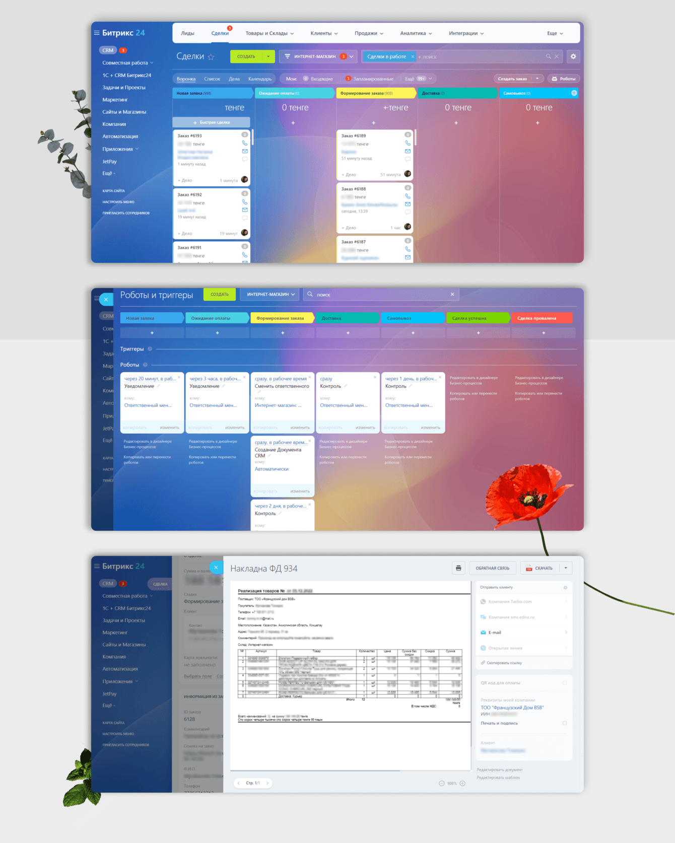 — Заказы с сайта автоматически попадают в CRM Битрикс24. В карточку сделки передаются данные из заказа (товары, цены, контакты, адрес доставки или самовывоза)