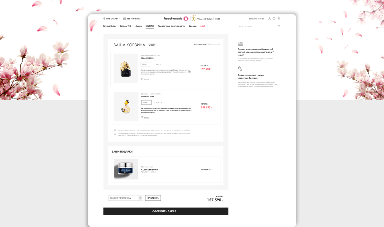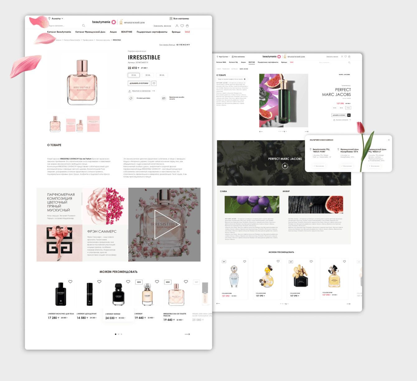 У заказчика раньше было 2 сайта. На сайте Французский Дом продавалась косметика и парфюмерия класса Luxe, в магазине Beautymania — масс-маркет продукция. В интернет-магазинах были сбои и ошибки. Интеграция с 1С работала неправильно, потому добавление и обновление товаров требовало много сил и времени сотрудников.