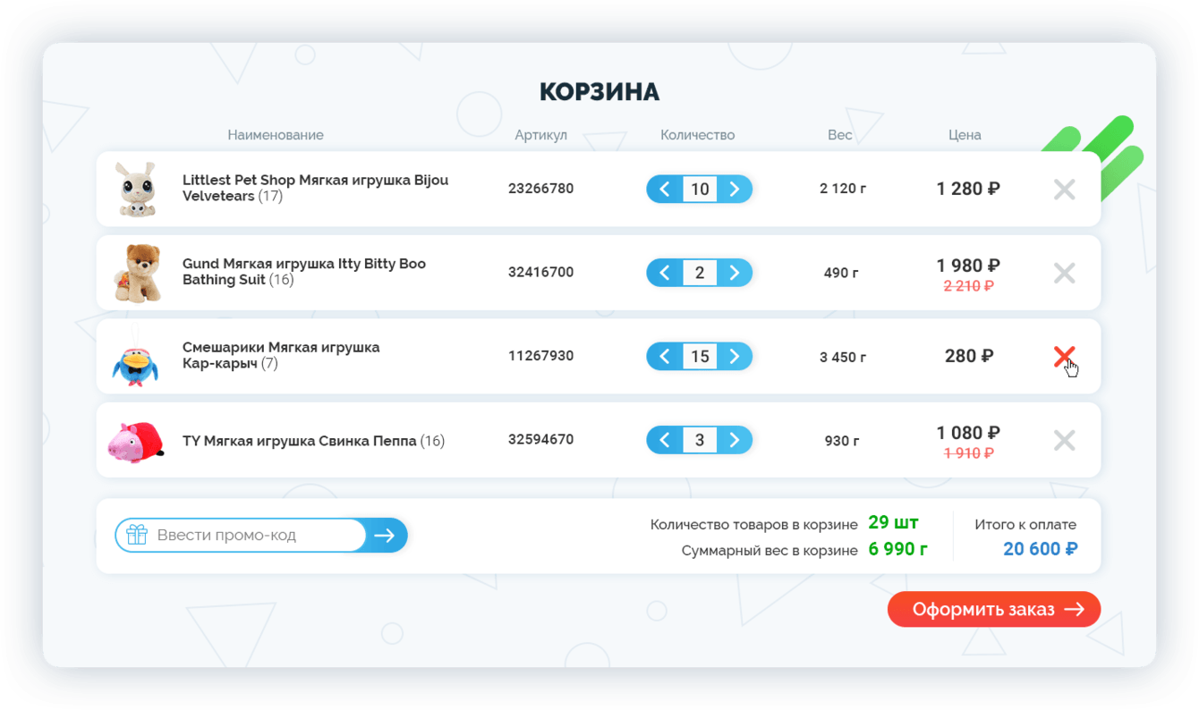 - демонстрация применённых акций и скидок;