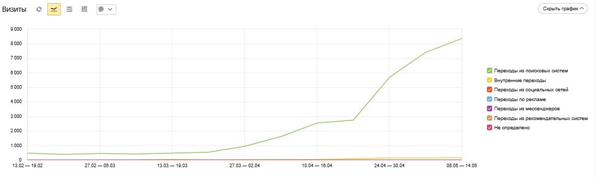 График по неделям показывает, что количество визитов из поисковых систем выросло в 17 раз: