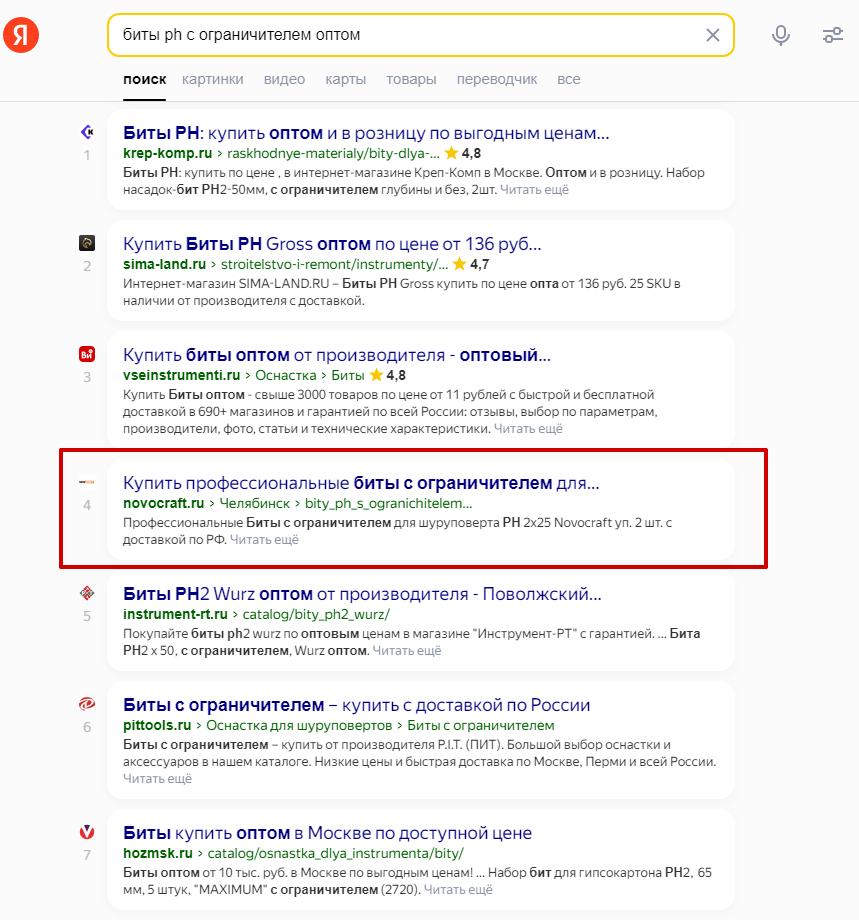 Пример ключевой фразы в ТОП-10 по оптовому направлению:
