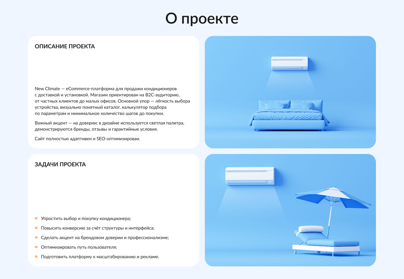 Заказчик: New Climate — компания, занимающаяся продажей климатического оборудования: кондиционеров, систем вентиляции и очистителей воздуха.