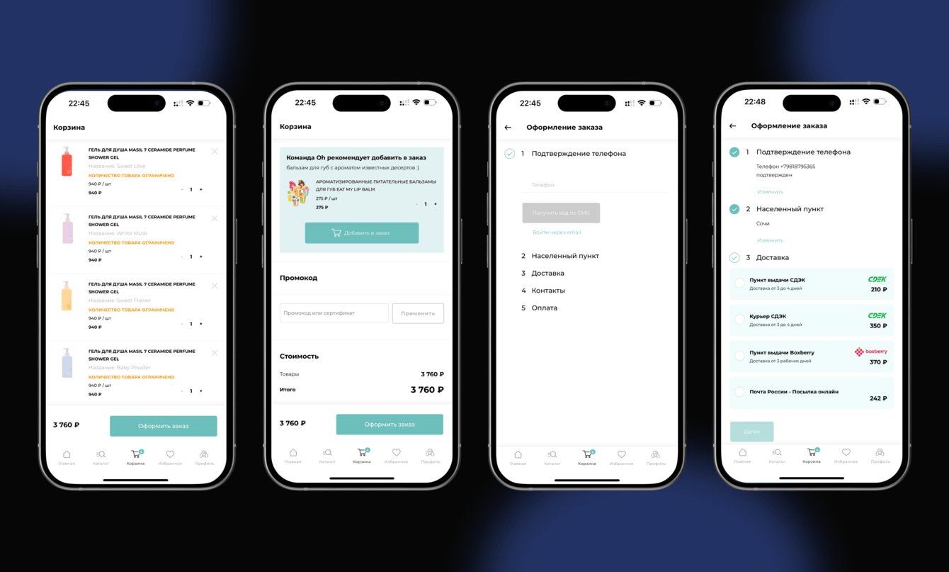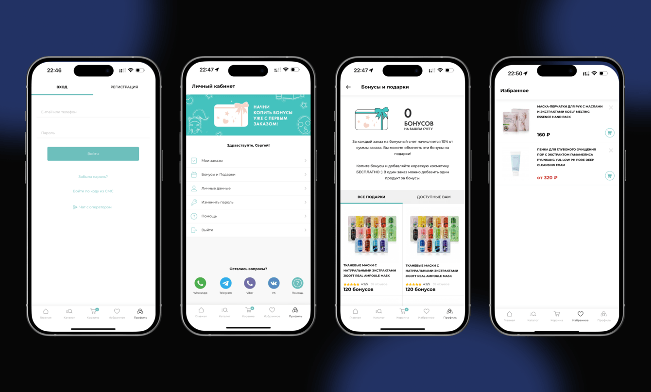 Мы создали полноценное мобильное приложение для интернет-магазина косметики, с типовым, но тщательно проработанным e‑commerce функционалом.
