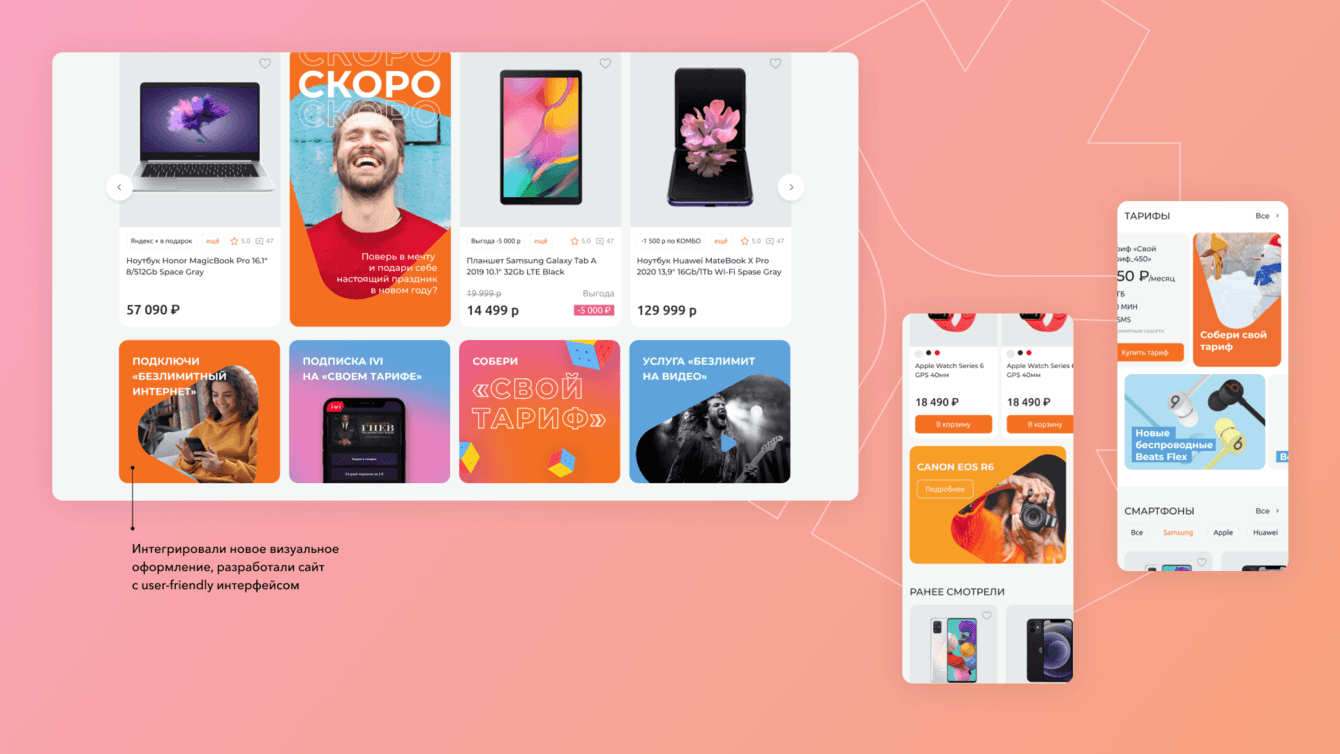 Мы разработали новый интернет-магазин для продажи товарного ассортимента, доступного в оффлайн-салонах, и поддержки маркетинговых акций. Новый eCommerce проект также даёт возможность приобретать комплекты для самоподключения абонентов.