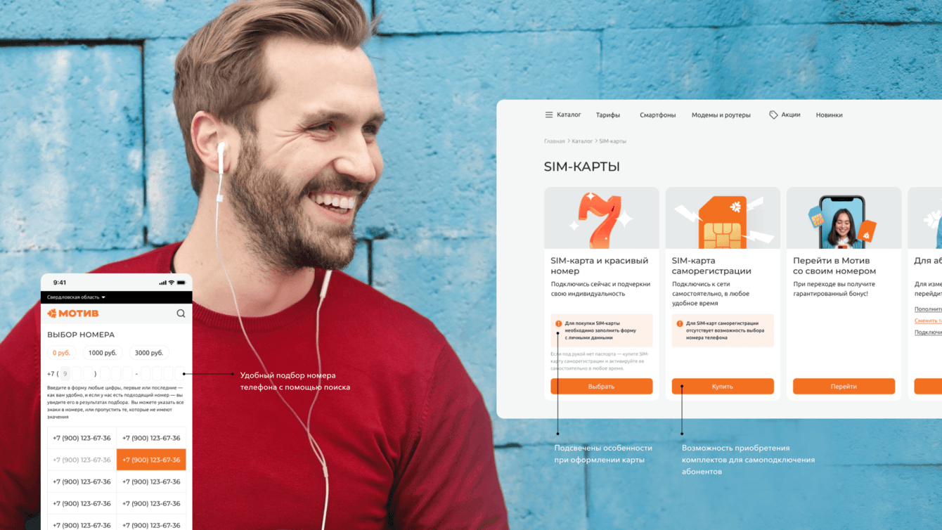 Кроме покупки товаров из каталога, на сайте доступна возможность подключиться к мобильному оператору Motiv — комплект для самоподключения может быть доставлен курьером, а выбор тариф или настройки пакетов интегрированы с личным кабинетом.