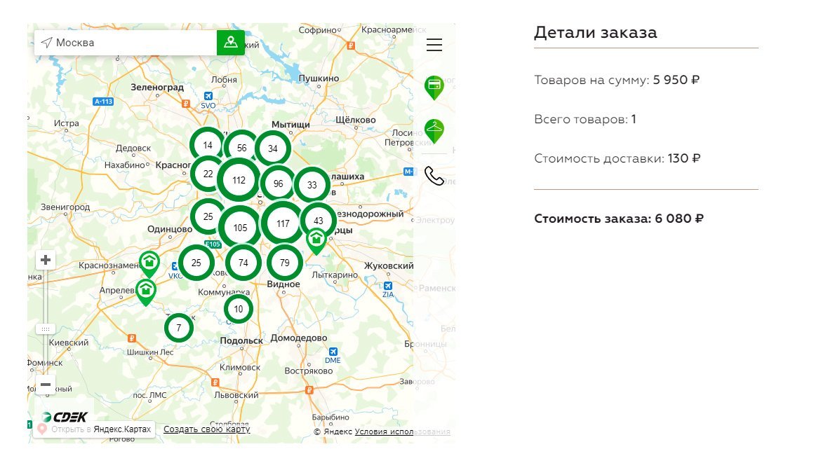 Реализована интеграция сайта со службой доставки СДЭК. С помощью данного модуля можно выбрать пункт самовывоза на карте практически в любом городе России.