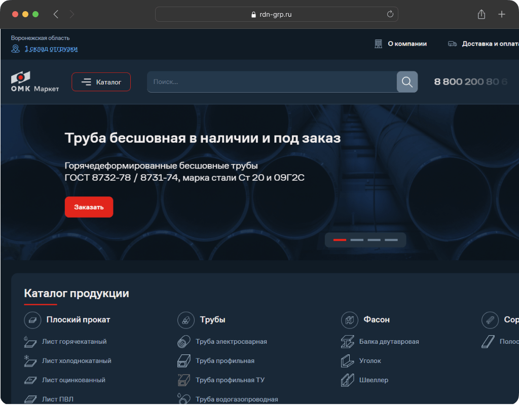 Был реализован базовый функционал интернет-магазина, который позволяет делать «ОМК Маркет» простым для клиентов. Это достигается за счет каталога с фильтрами, который был подготовлен специально под характеристики металлопроката, а также удобного поиска по сайту и актуальных цен. Разработчики составили приоритетные характеристики для сортировки по каждому из разделов, а также вынесли характеристики в фильтры, которые удобно использовать. Анализ поведения пользователей на сайте позволил реализовать удобный UI/UX-дизайн.