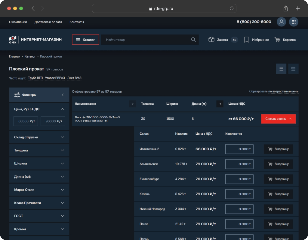 Разработать интернет-магазин по металлургической продукции с отображением свободных остатков на разных складах ОМК.