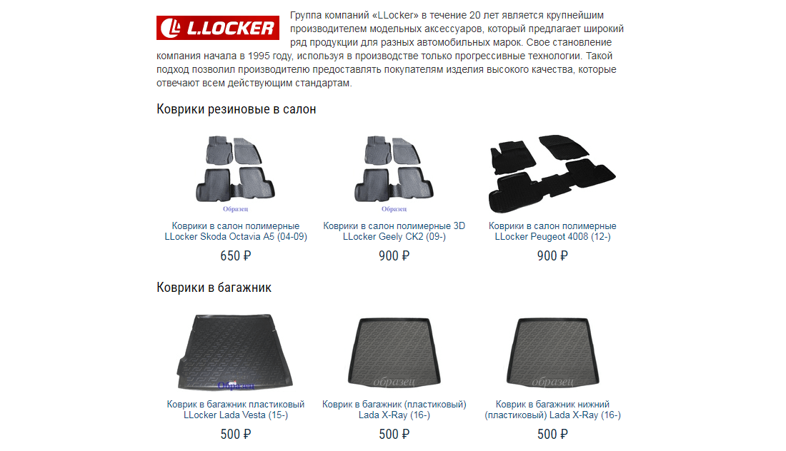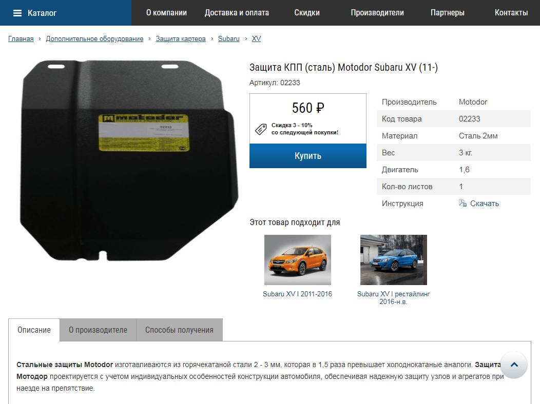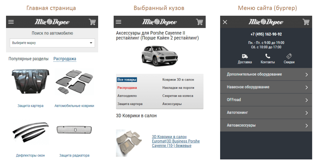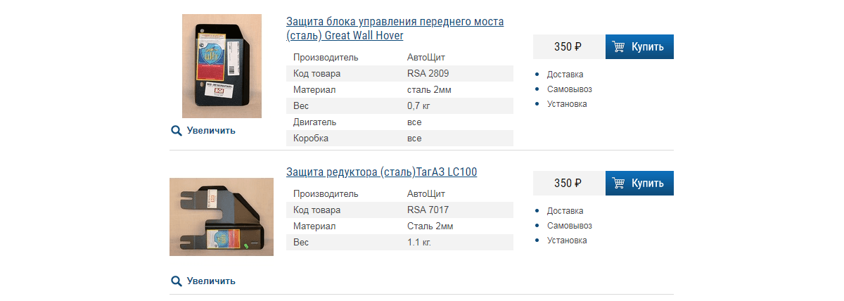 Продажа дополнительного оборудования и запчастей для иномарок и отечественных авто. Основные категории товаров: защита картера, дефлекторы боковых окон, автомобильные коврики, фаркопы, брызговики, чехлы на сиденья. Продажа в розницу по всей России.