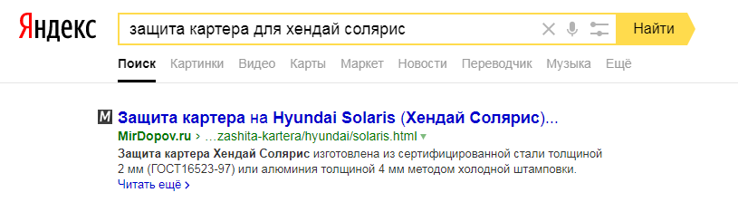 - На страницы каталога заходят новые пользователи по точным запросам, вроде “Защита картера для Хендай Солярис”