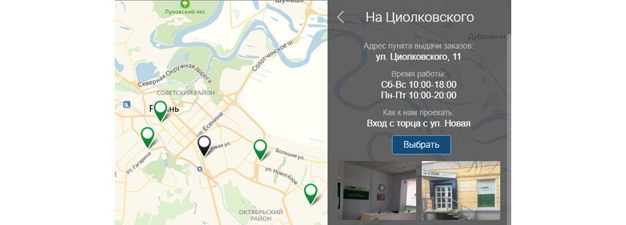 К сайту подключен модуль GEOIP, который по IP-адресу автоматически определяет местонахождение посетителя. При оформлении заказа, есть возможность выбрать на карте точку самовывоза СДЭК в вашем городе. Информация о доставке попадает в админку сайта, а также отправляется на Email пользователя.
