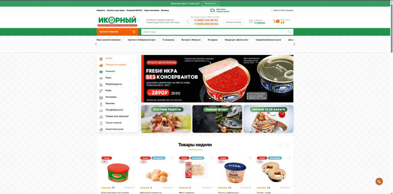 Разработать интернет-магазин для компании «Икорный», специализирующейся на поставке и продаже морепродуктов с Дальнего Востока. Сайт должен был представить продукцию компании, её преимущества и обеспечить удобство взаимодействия для потенциальных клиентов.