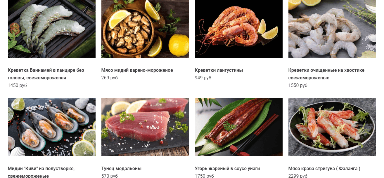 3. На главную страницу сайта вывели каталог товаров по категориям: «Популярные товары» и 4 самых популярных позиции из раздела «Рыба».