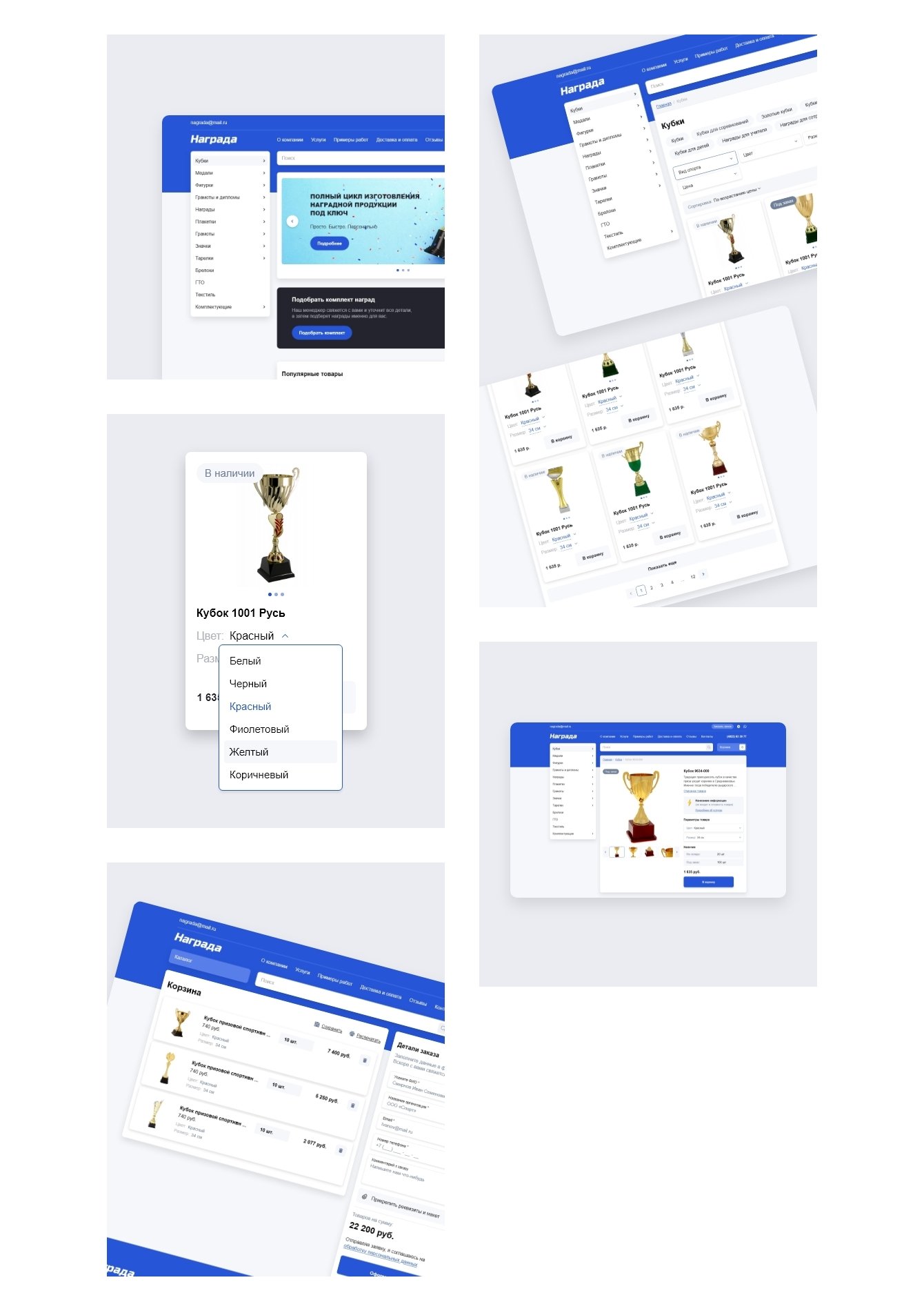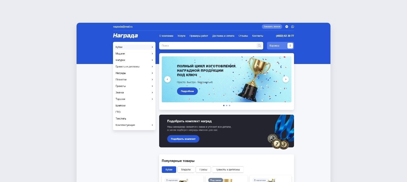 Необходимо было разработать удобный онлайн-каталог наградной продукции для узкой целевой аудитории, который будет вызывать доверие. Настроить интеграцию с выгрузками от оптовых поставщиков и производителей кубков и медалей. Провести SEO-оптимизацию для дальнейшего поискового продвижения сайта в Яндекс и Google. Настроить площадку для управления сайтом 1С-Битрикс. Разработать логотип и визуальный стиль.