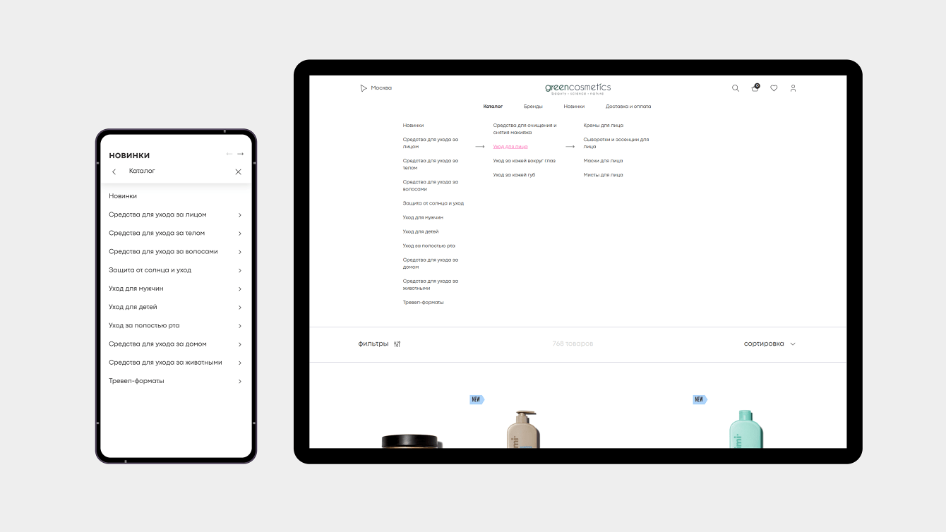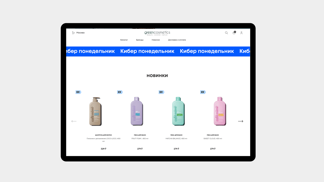 Клиент пришел к нам с задачей сделать обновленный визуально и технически современный сайт, интегрированный с 1С, с удобной административной панелью и возможностью самостоятельно редактировать контент. Сайт должен стать инструментом для дальнейшего развития в e-Commerce и быть удобным как для покупателей, так и для работы с ним команды Greencosmetics.