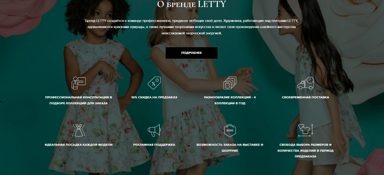 Бренд Letty является производителем коллекционных направлений : праздничные платья для особых случаев , изящной повседневной одежды и школьной формы Letty Classic , для истинных ценителей стиля и элегантности.